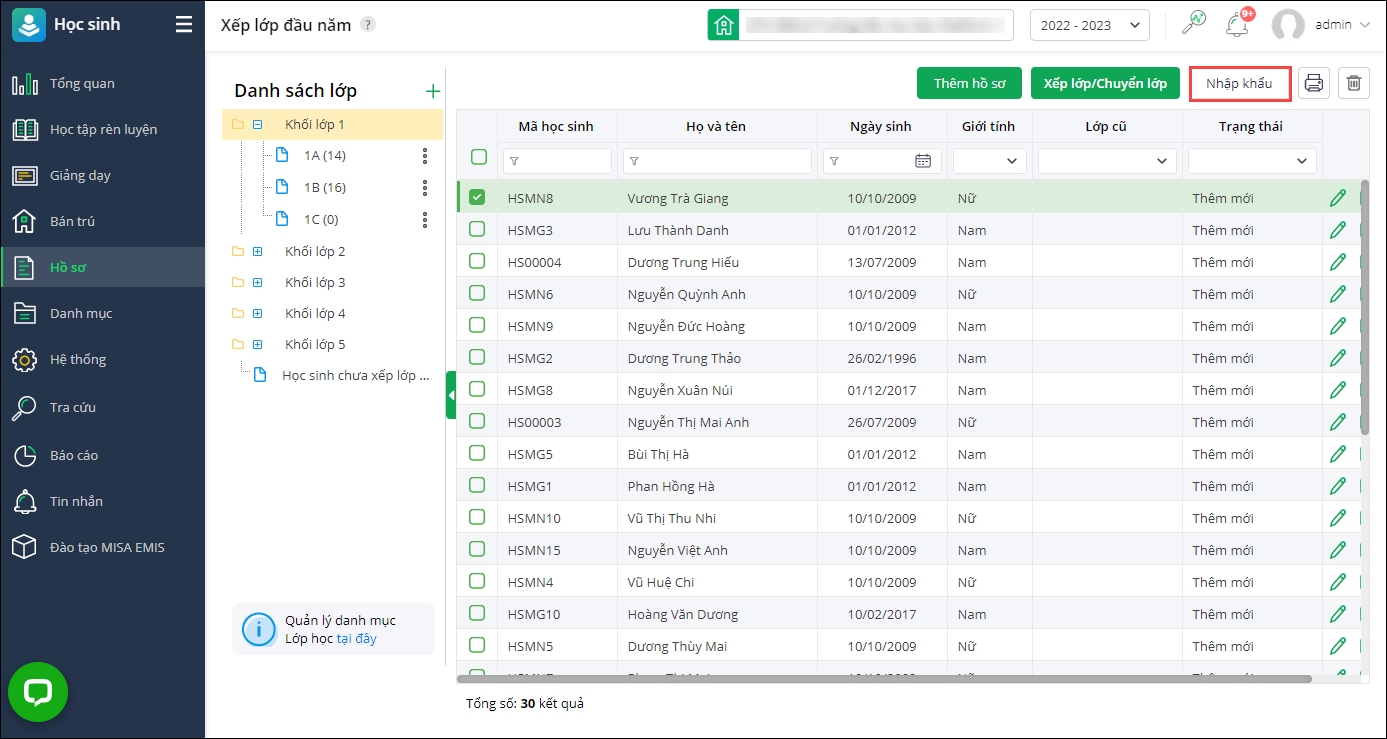 - Tại màn hình Xếp lớp đầu năm, chọn Nhập khẩu.