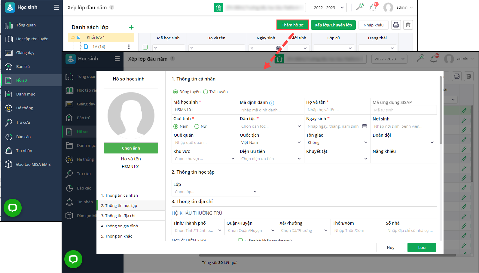 Trường hợp có học sinh mới chuyển đến, anh/chị chọn Thêm hồ sơ và khai báo thông tin học sinh.
