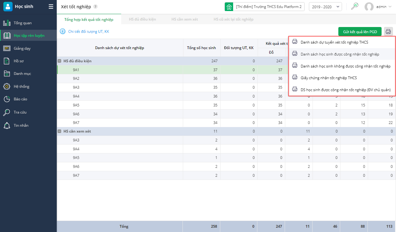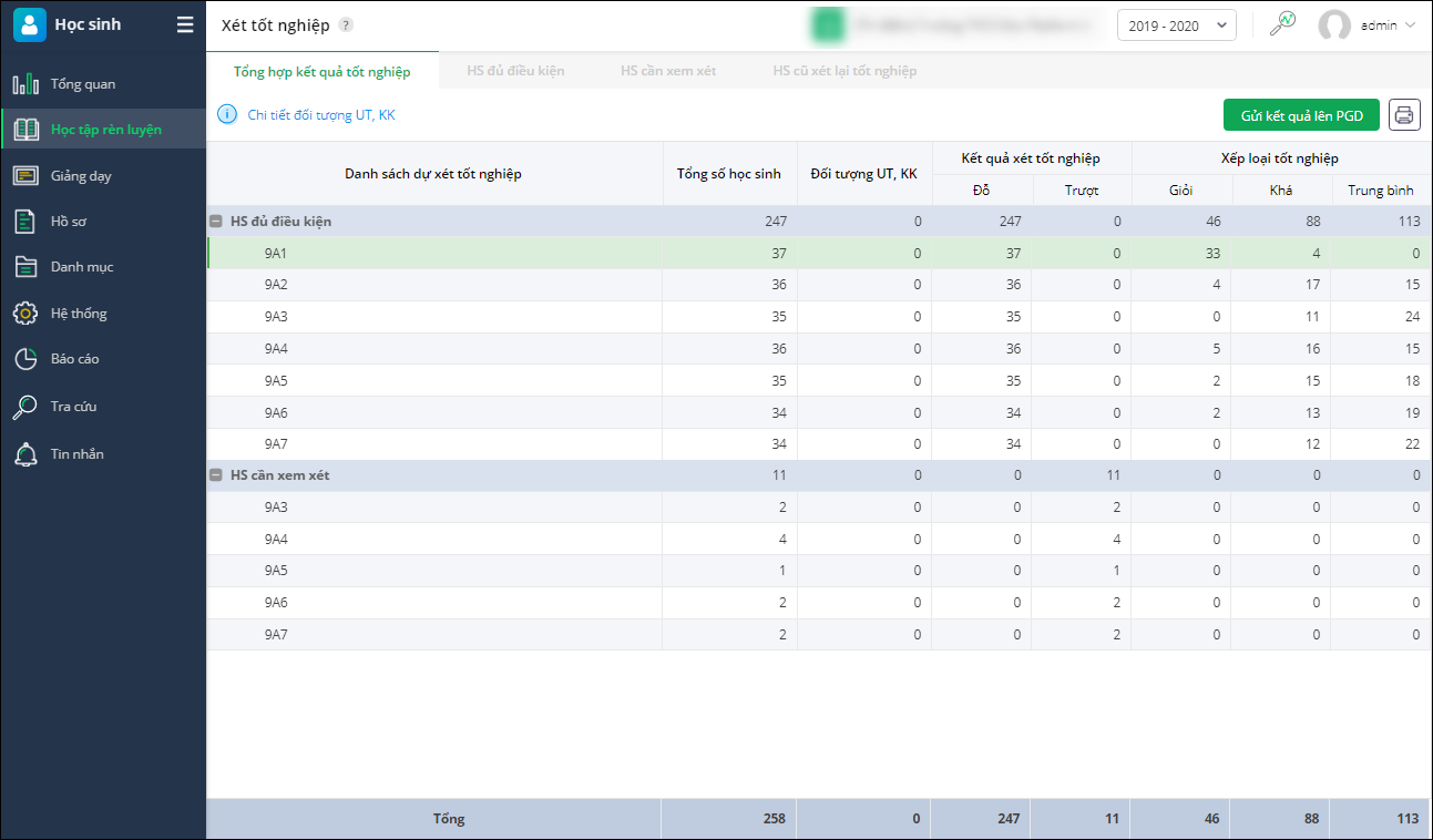- Tại đây phần mềm đã tự động tổng hợp lại danh sách học sinh đủ điều kiện và không đủ điều kiện để xét tốt nghiệp theo kết quả tổng hợp đánh giá trước đó.