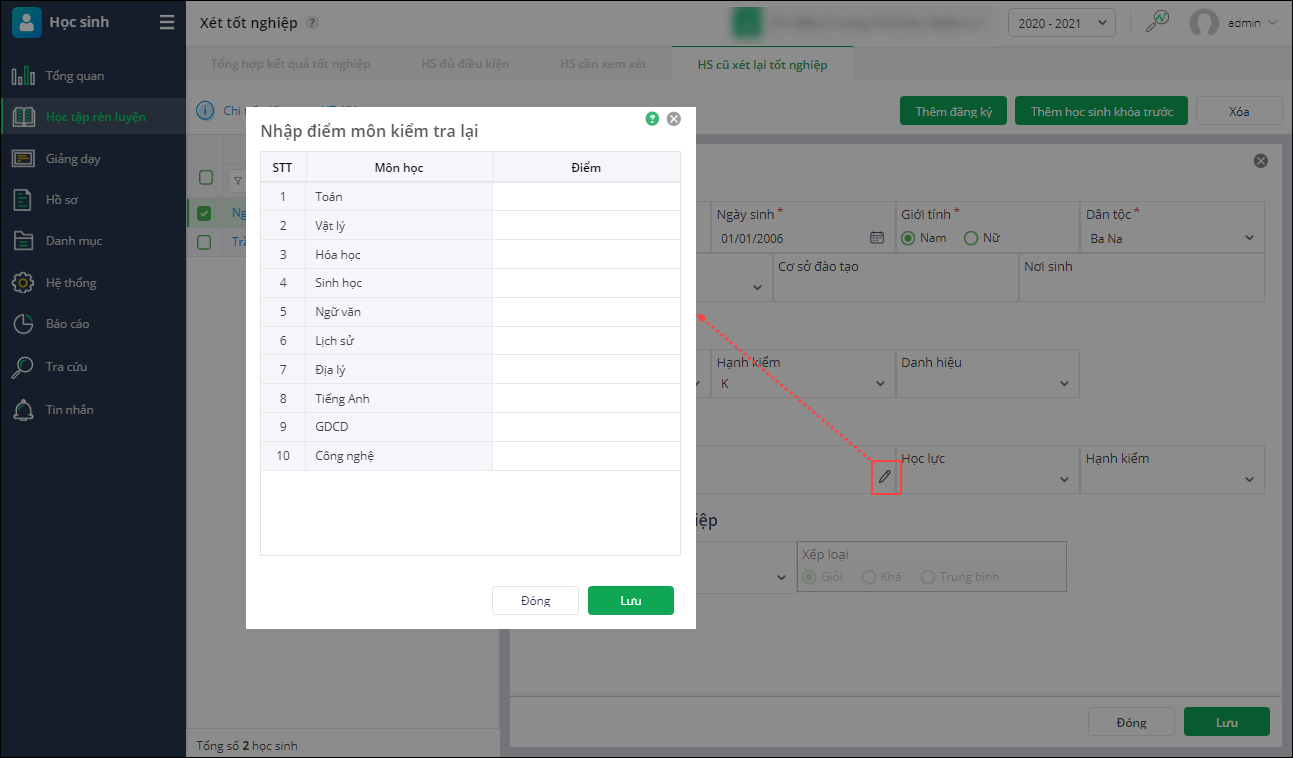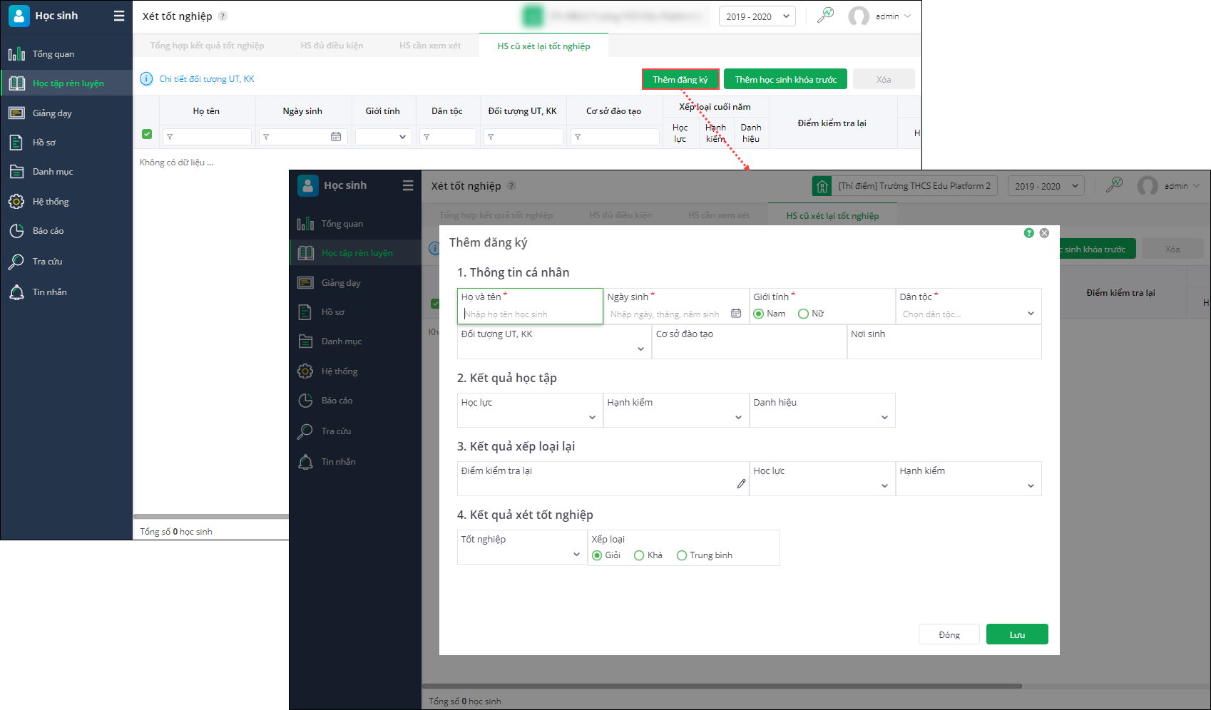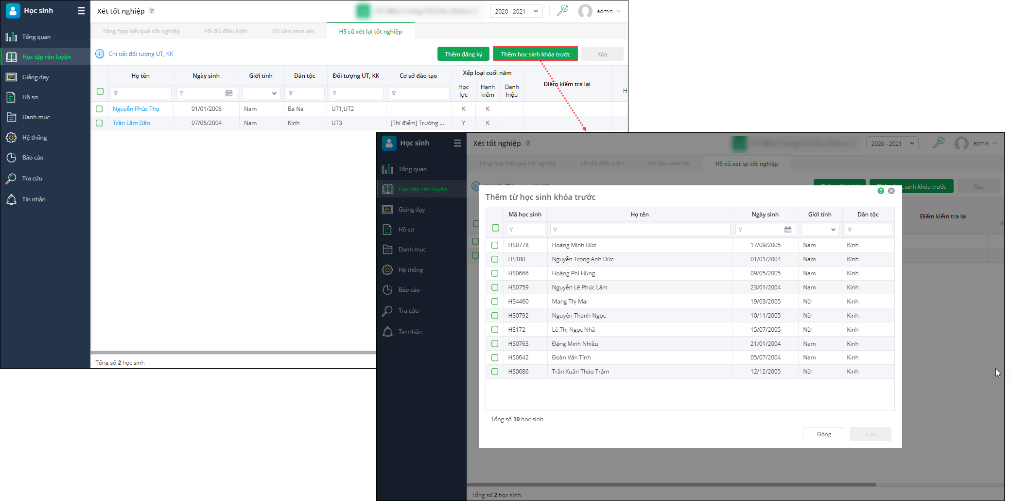 - Trong trường hợp trường có học sinh trượt tốt nghiệp từ khóa trước thì có thể thực hiện xét tốt nghiệp cùng với học sinh trong khóa này bằng cách nhấn Thêm học sinh khóa trước.