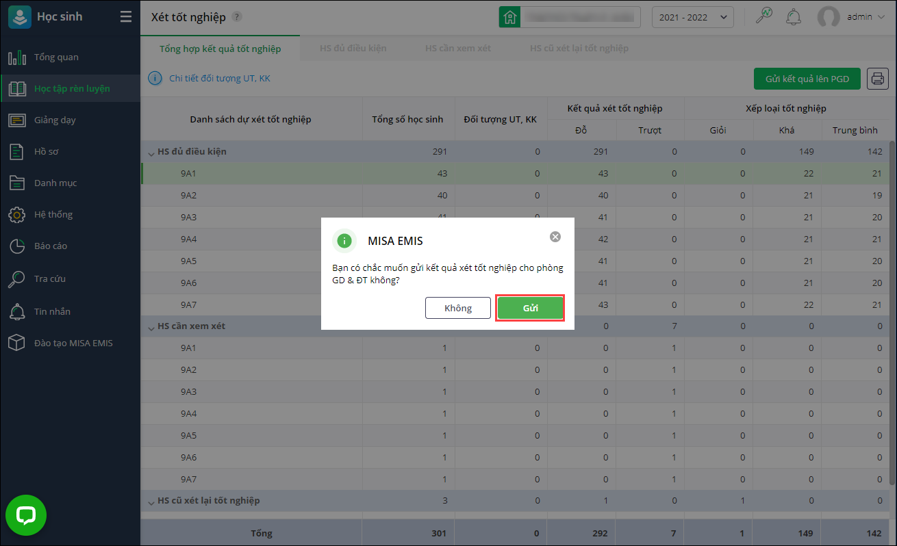 - Nhấn Gửi kết quả lên PGD để gửi kết quả tổng hợp xét tốt nghiệp lên đơn vị chủ quản của mình, xác nhận Gửi.