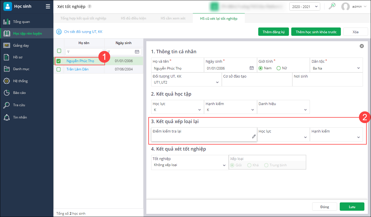- Trong trường hợp trường có học sinh trượt tốt nghiệp từ khóa trước thì có thể thực hiện xét tốt nghiệp cùng với học sinh trong khóa này bằng cách nhấn Thêm học sinh khóa trước.
