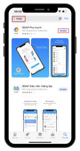 Bước 1: Vào Appstore, trên thanh công cụ tìm kiếm “SISAP phụ huynh”. Chọn ứng dụng SISAP Phụ huynh rồi nhấn Nhận để tải về ứng dụng.