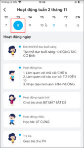 - Sau khi giáo viên lên kế hoạch hoạt động tuần, phụ huynh chọn vào ngày trong tuần để thấy các hoạt động trong ngày của con.