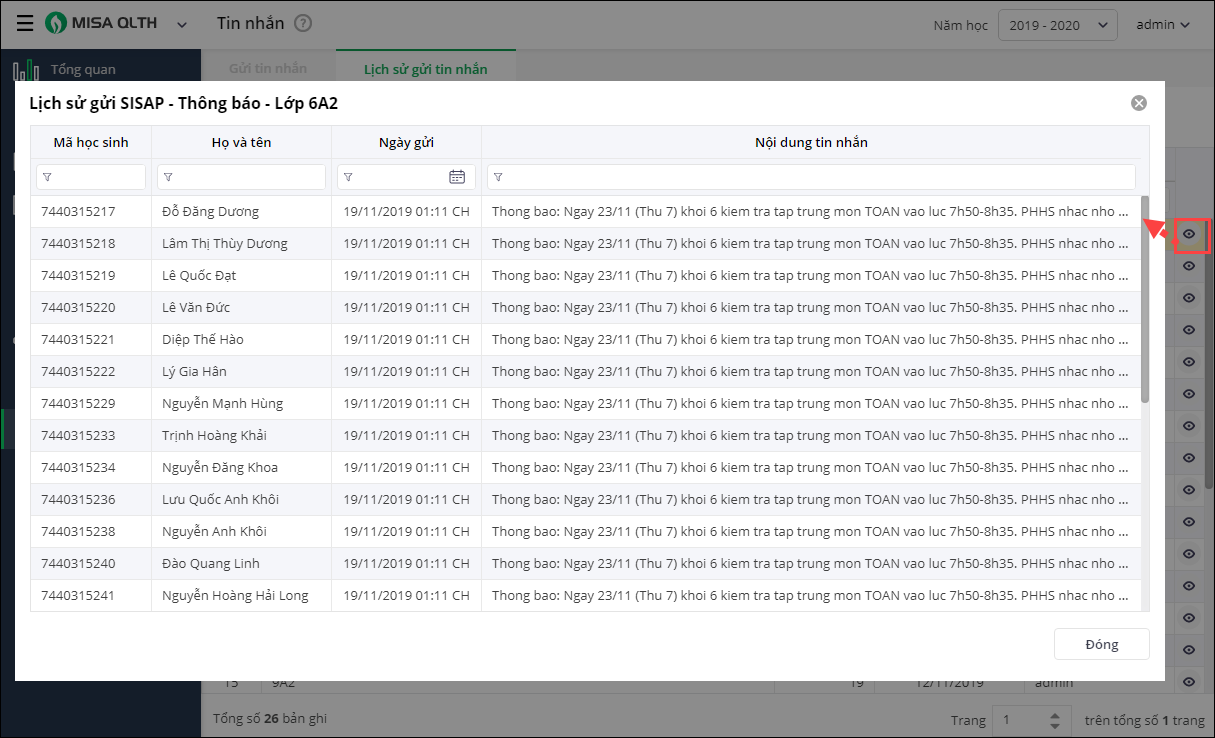 - Nhấn biểu tượng “con mắt” để theo dõi chi tiết về lịch sử gửi tin nhắn của từng lớp/nhóm học sinh/học sinh.