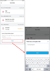 - Để lưu ý cho giáo viên vấn đề liên quan đến sức khỏe của trẻ, chọn Thêm. Nhập lưu ý và xác nhận Thêm.