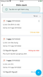 3. Sau khi tạo đơn xin nghỉ thành công, đơn sẽ được chuyển đến giáo viên phụ trách và hiển thị trạng thái Chờ xác nhận trong danh sách. Phụ huynh vui lòng đợi giáo viên phê duyệt và phản hồi.