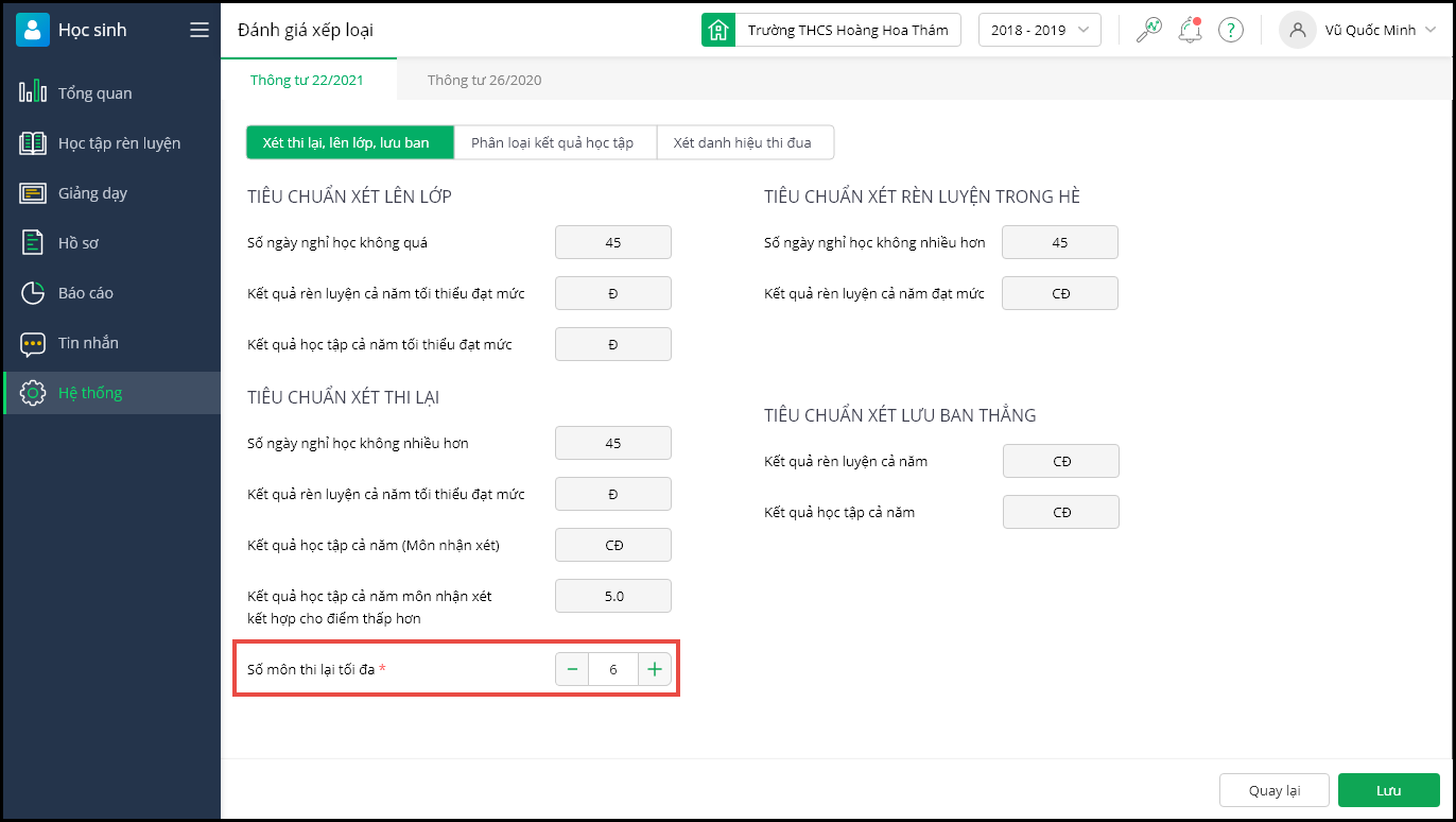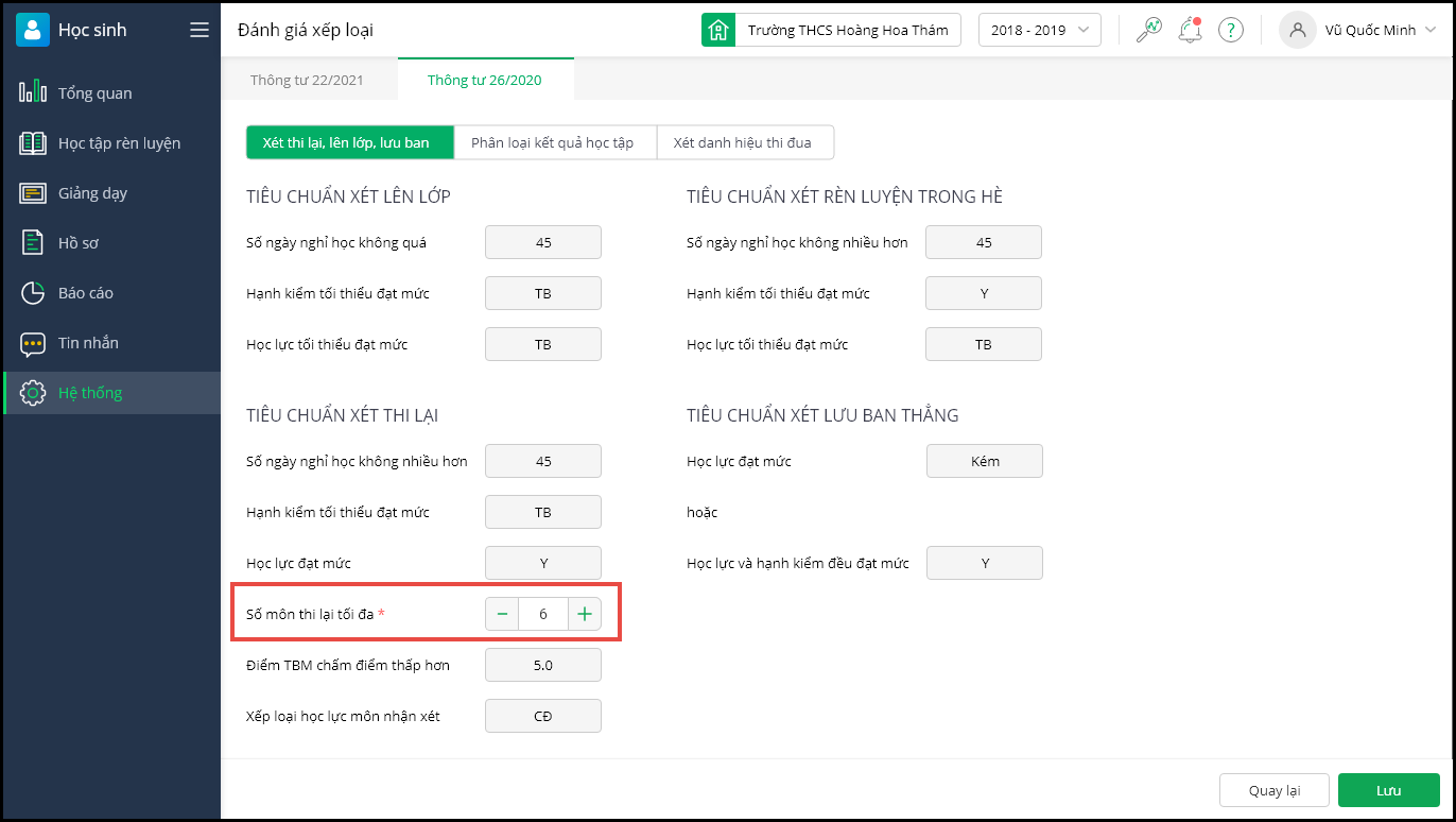 Tại đây, theo dõi các tiêu chuẩn xét Thi lại, Rèn luyện trong hè, Lên lớp, Lưu ban thẳng cho học sinh. Anh chị có thể điều chỉnh Số môn thi lại tối đa phù hợp với quy định của của trường.