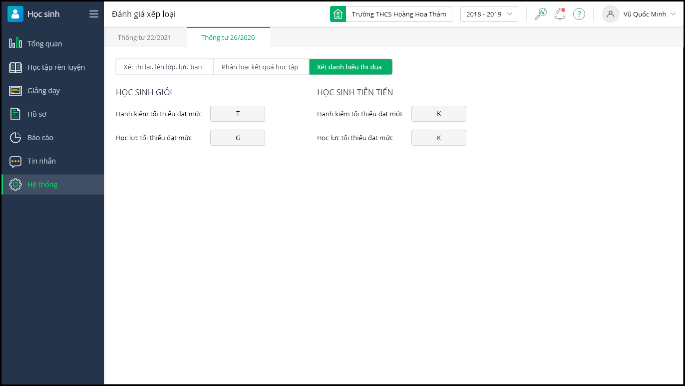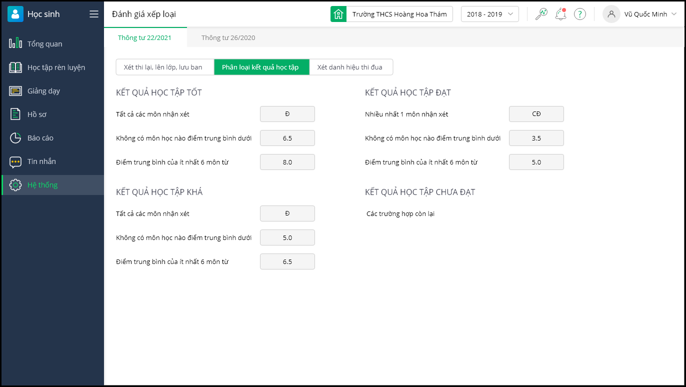 - Tại đây, phần mềm đã mặc định thiết lập các điều kiện về đánh giá xếp loại, xét tốt nghiệp theo 2 thông tư: Thông tư 22/2021/TT-BGDĐT và Thông tư 26/2020/TT-BGDĐT. Theo dõi thông tin về tiêu chuẩn Xét thi lại, lên lớp, lưu ban; Phân loại kết quả học tập; Xét danh hiệu thi đua tương ứng với quy định của mỗi thi Thông tư.