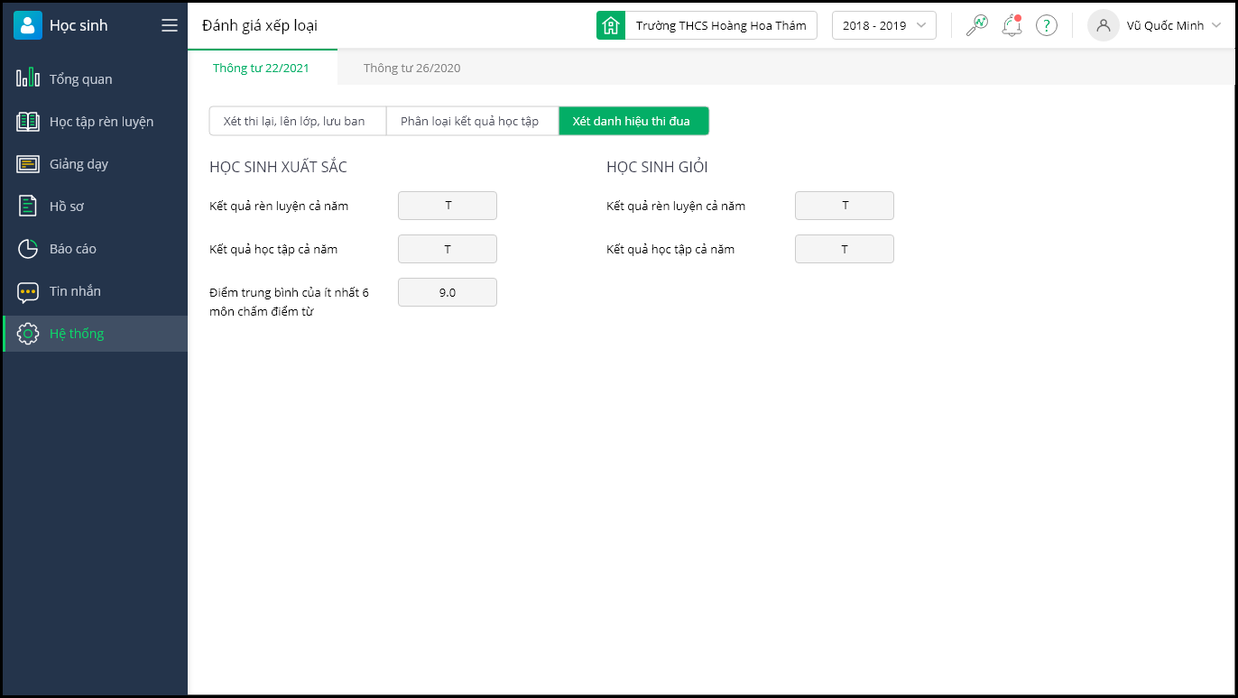Theo dõi các tiêu chí xét danh hiệu thi đoa: Học sinh xuất sắc, Học sinh giỏi.