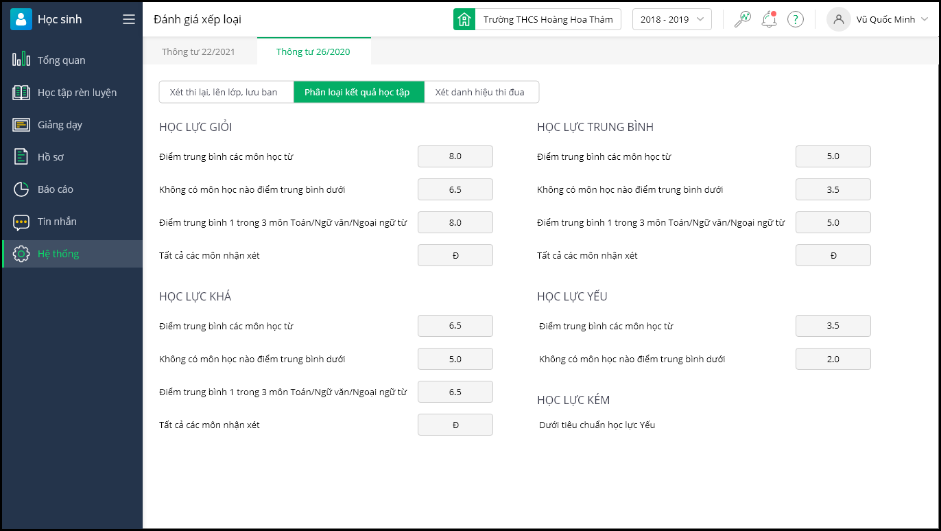 Theo dõi các tiêu chí phân loại kết quả học tập: Giỏi, Khá, Trung bình, Yếu, Kém.