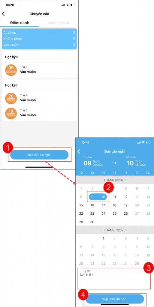 - Ứng dụng đưa ra thông báo để phụ huynh biết đã nộp đơn xin nghỉ thành công. Sau khi phụ huynh nộp đơn thì đơn xin nghỉ sẽ tự động được gửi lên giáo viên chủ nhiệm của con em mình.
