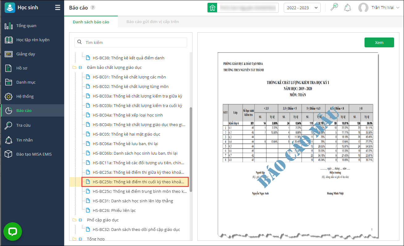 - Nhấp đúp chuột vào báo cáo cần xem trên danh sách hoặc chọn báo cáo trên danh sách, nhấn Xem.