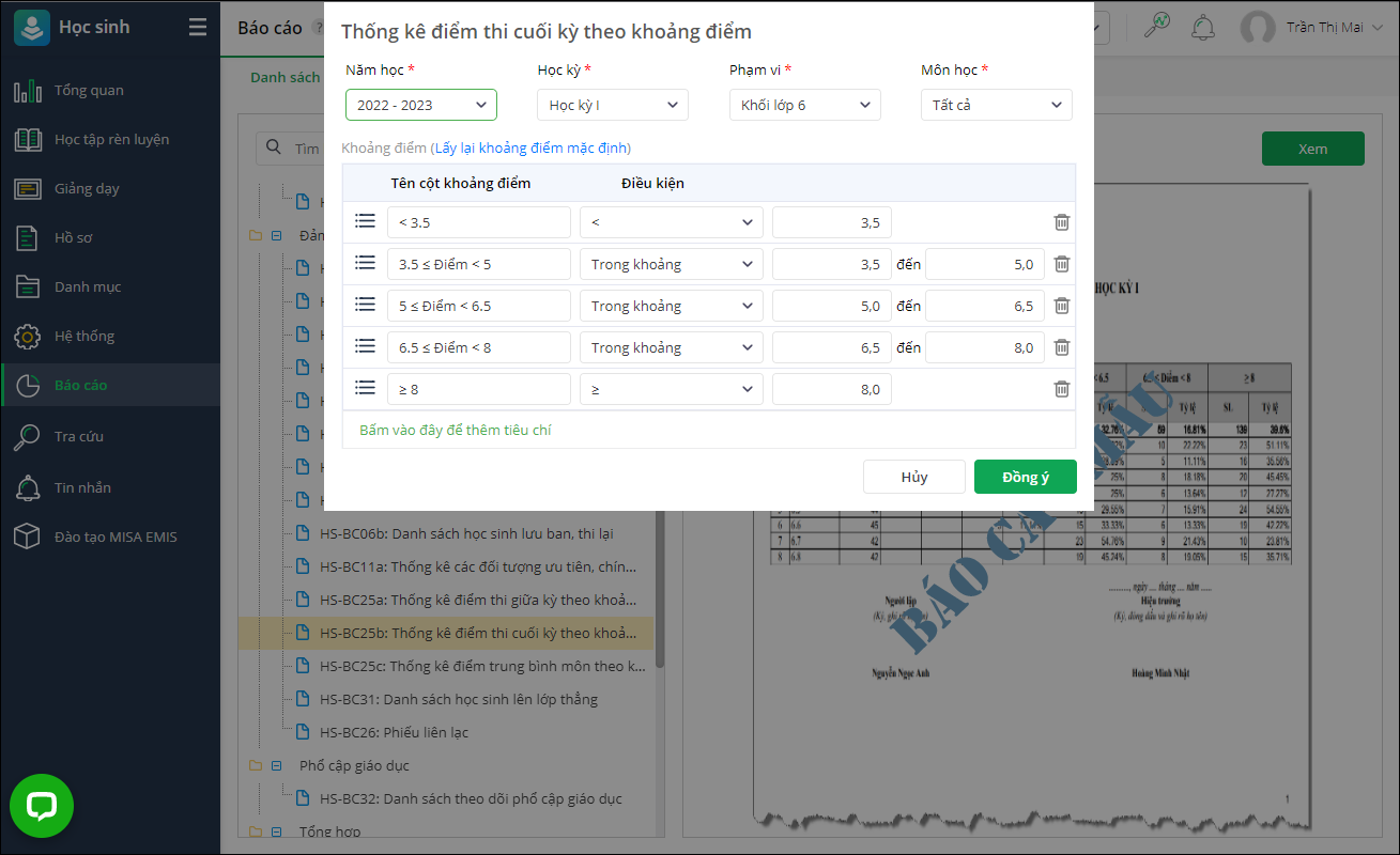 - Vào Báo cáo\Danh sách báo cáo\Đảm bảo chất lượng giáo dục. Chọn HS-BC25b: Thống kê điểm thi cuối kỳ theo khoảng điểm.
