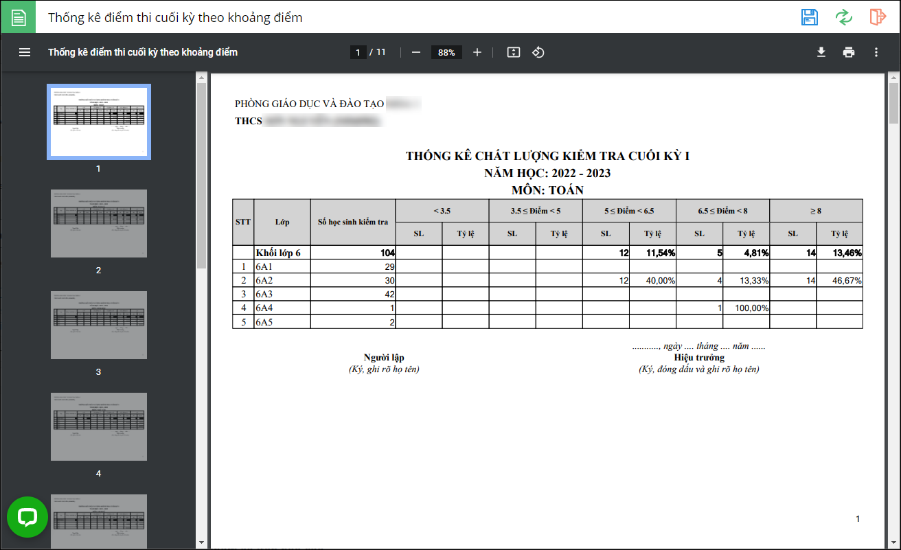 Trước khi lập báo cáo thống kê chất lượng kiểm tra học kỳ, anh/chị cần thực hiện nhập điểm kiểm tra học kỳ các môn được lấy lên báo cáo trong kỳ học được chọn tại Sổ theo dõi và đánh giá học sinh.