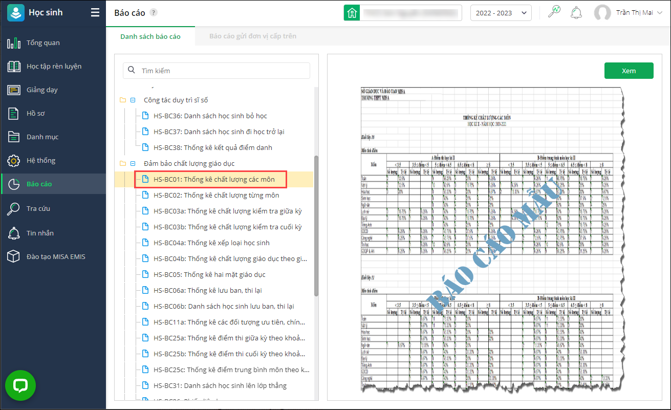 - Nhấp đúp chuột vào báo cáo cần xem trên danh sách hoặc chọn báo cáo trên danh sách, nhấn Xem.