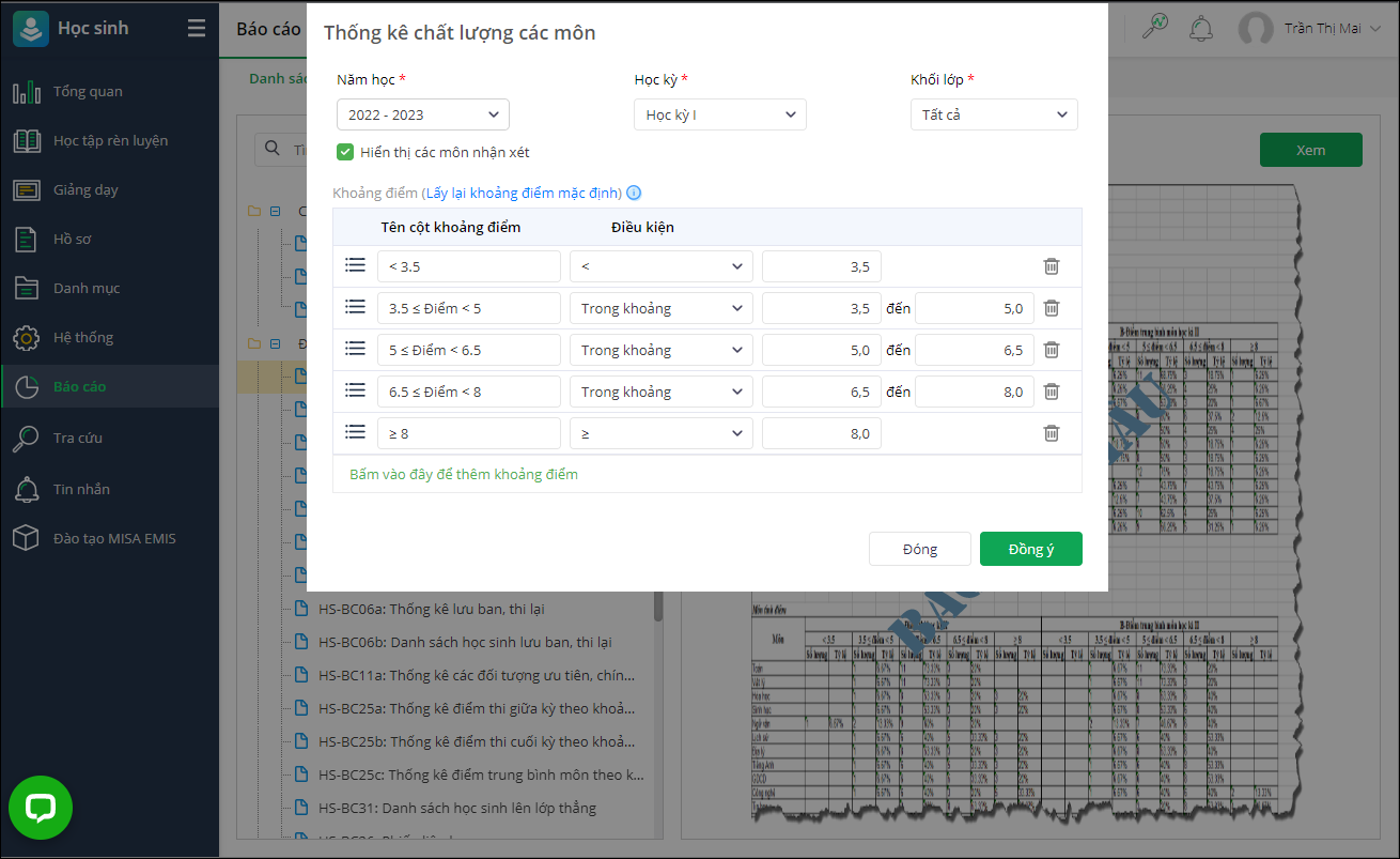 - Vào Báo cáo\Danh sách báo cáo\Đảm bảo chất lượng giáo dục. Chọn HS-BC01: Báo cáo thống kê chất lượng các môn.