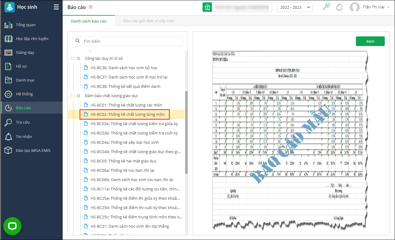 - Nhấp đúp chuột vào báo cáo cần xem trên danh sách hoặc chọn báo cáo trên danh sách, nhấn Xem.