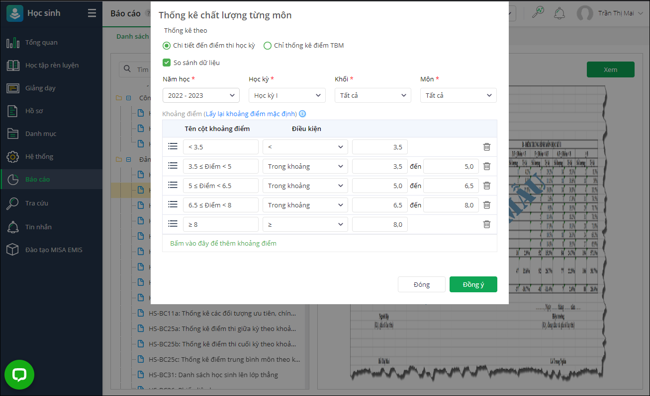 - Lựa chọn thống kê báo cáo theo: Chi tiết đến điểm học kỳ hoặc Chỉ thống kê điểm TBM.