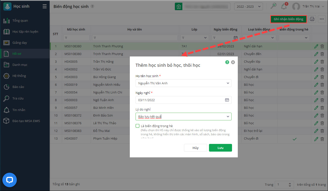 - Vào Hồ sơ\ Biến động, thực hiện ghi nhận biến động học sinh.
