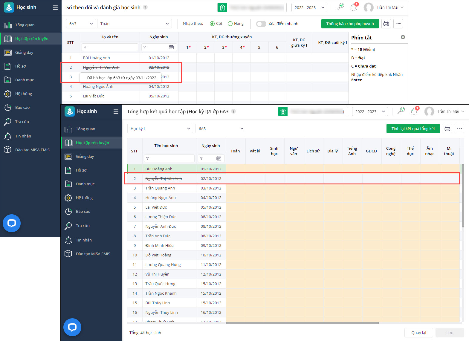 - Chỉ không thực hiện tổng kết kết quả cuối kỳ/cuối năm đối với học sinh chuyển đi, nghỉ học dài hạn, Bỏ học, thôi học