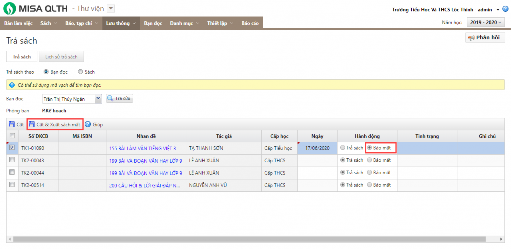 Trong trường hợp người mượn làm mất sách, tại cột Hành động, chọn Báo mất. - Nhấn Cất & Xuất sách mất để ghi nhận mất sách.