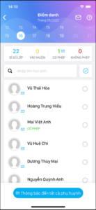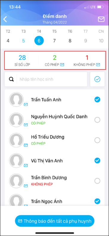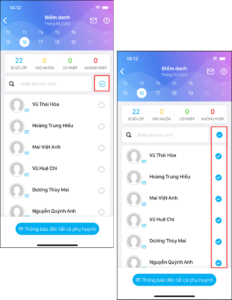 - Giáo viên có thể điểm danh nhanh cho cả lớp bằng cách tích chọn tất cả.