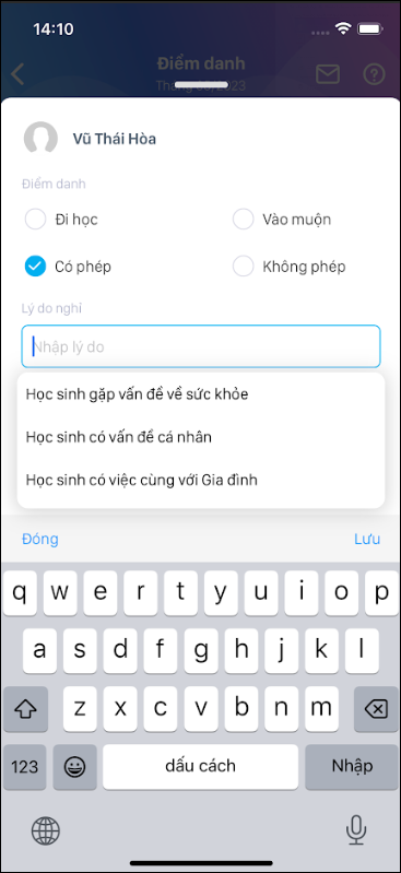 - Với học sinh nghỉ học có phép, giáo viên có thể nhập nhanh lý do nghỉ để báo cáo lên Ban Giám hiệu nhà trường, nhấn Lưu.