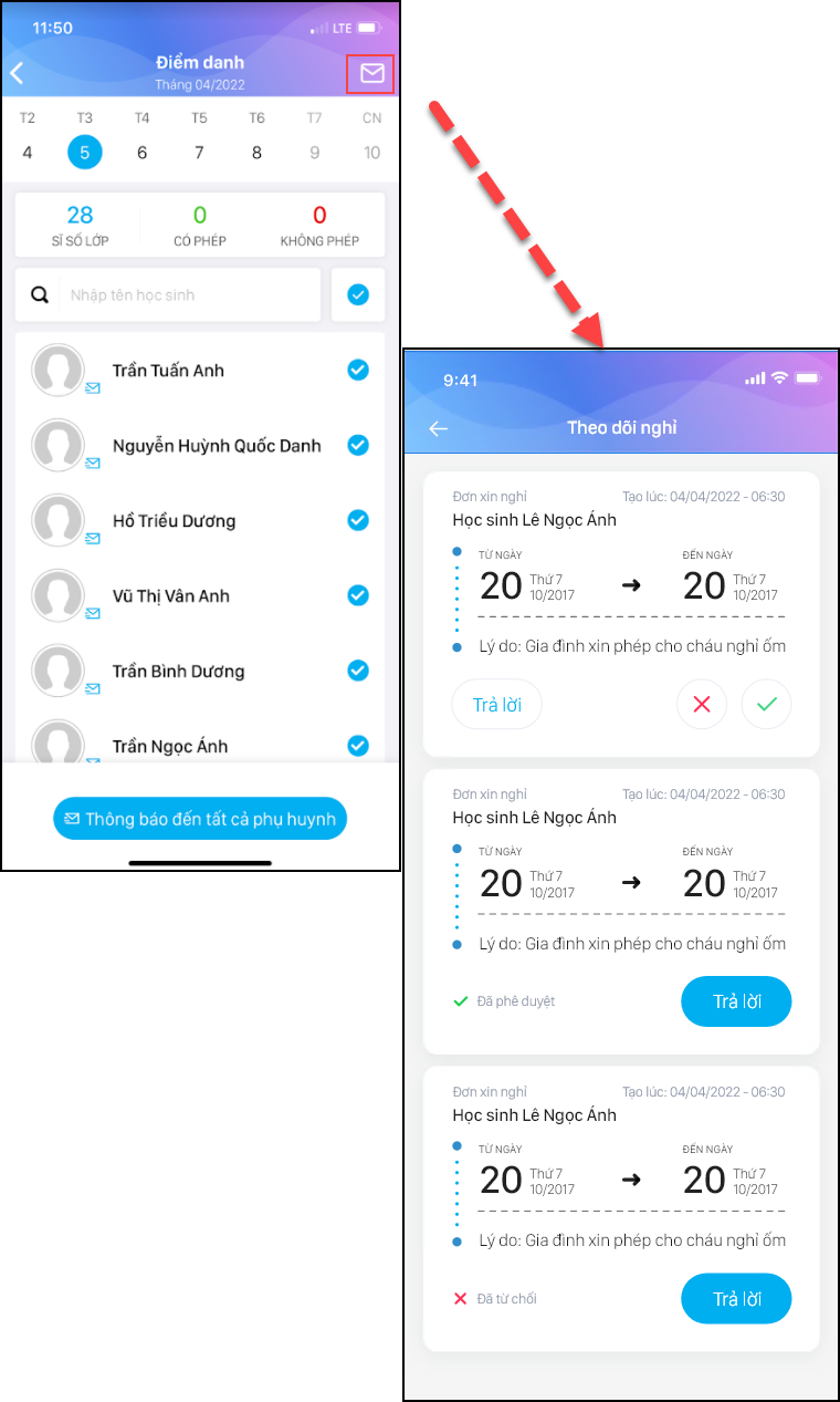 - Tại mục điểm danh, giáo viên nhấn chọn vào biểu tượng thư tại góc phải màn hình. Giáo viên có thể theo dõi danh sách đơn xin nghỉ học của học sinh, bao gồm: Tên học sinh, thời gian phụ huynh tạo đơn, thời gian nghỉ, lý do xin nghỉ.