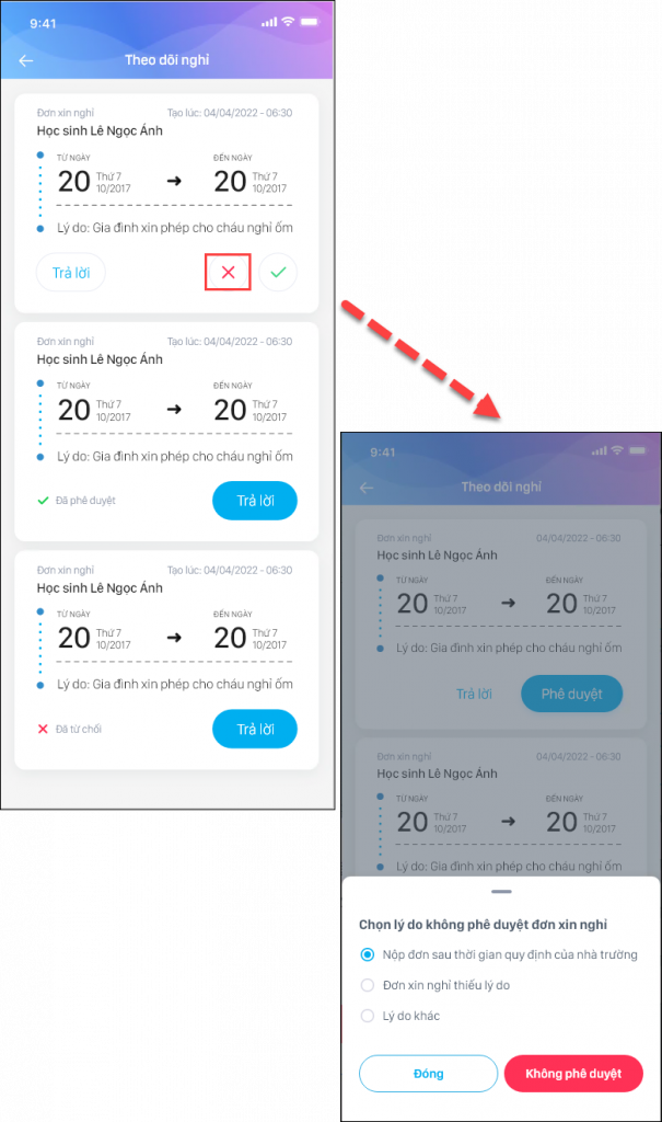 - Biểu tượng dấu x đỏ: từ chối đơn xin nghỉ nghỉ không đúng quy định (Ví dụ: Học sinh nghỉ học rồi phụ huynh mới làm đơn xin nghỉ phép bù,….