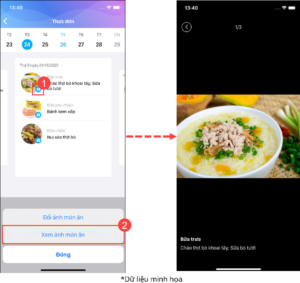 - Để xem chi tiết hình ảnh món ăn, nhấn vào biểu tượng “máy ảnh” tại bữa ăn, chọn Xem ảnh món ăn.