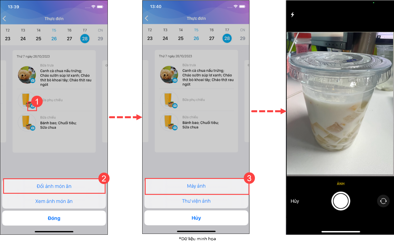 - Để thêm hình ảnh món ăn tương ứng từng bữa gửi phụ huynh học sinh, chọn vào biểu tượng “máy ảnh”, chọn Đổi ảnh món ăn. Chọn chụp từ máy ảnh hoặc thêm ảnh có sẵn từ Thư viện ảnh.