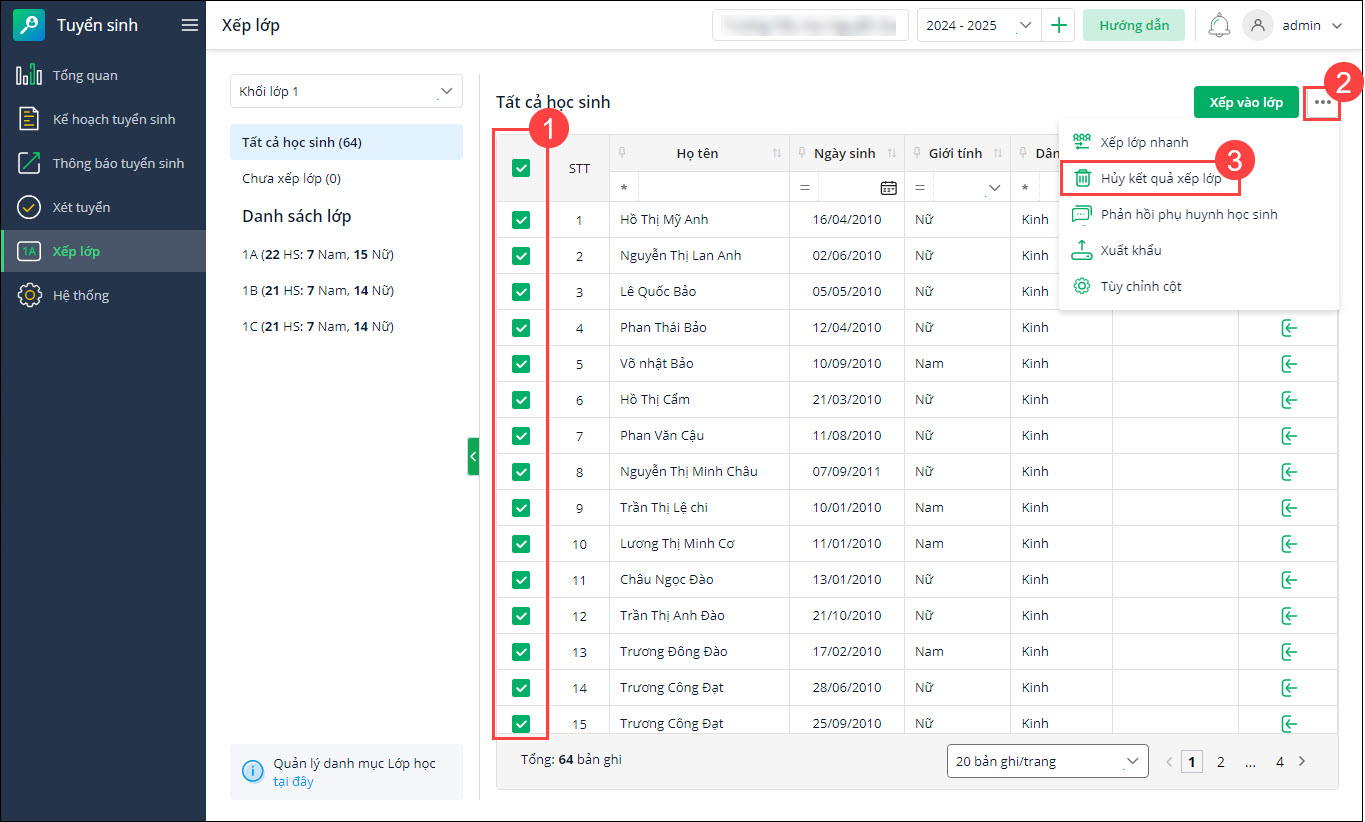 1. Sau khi xếp lớp cho học sinh, trường hợp hội đồng tuyển sinh muốn thay đổi kết quả xếp lớp và xếp lớp lại, tích chọn học sinh, nhấn vào dấu ba chấm, chọn Hủy kết quả xếp lớp.