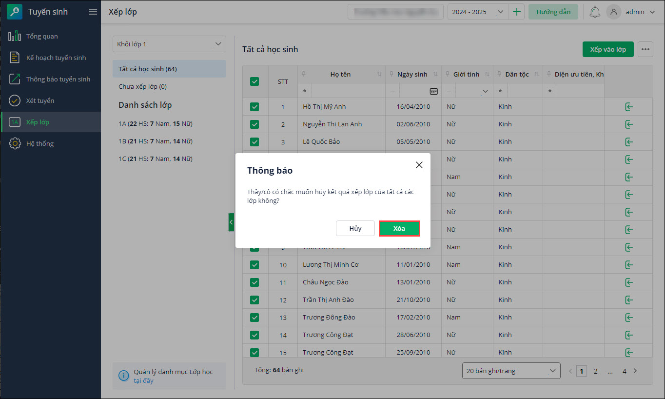 2. Xác nhận hủy kết quả, hồ sơ học sinh sẽ được chuyển về danh sách Chưa xếp lớp.