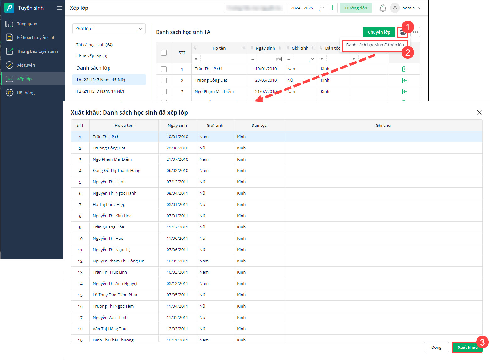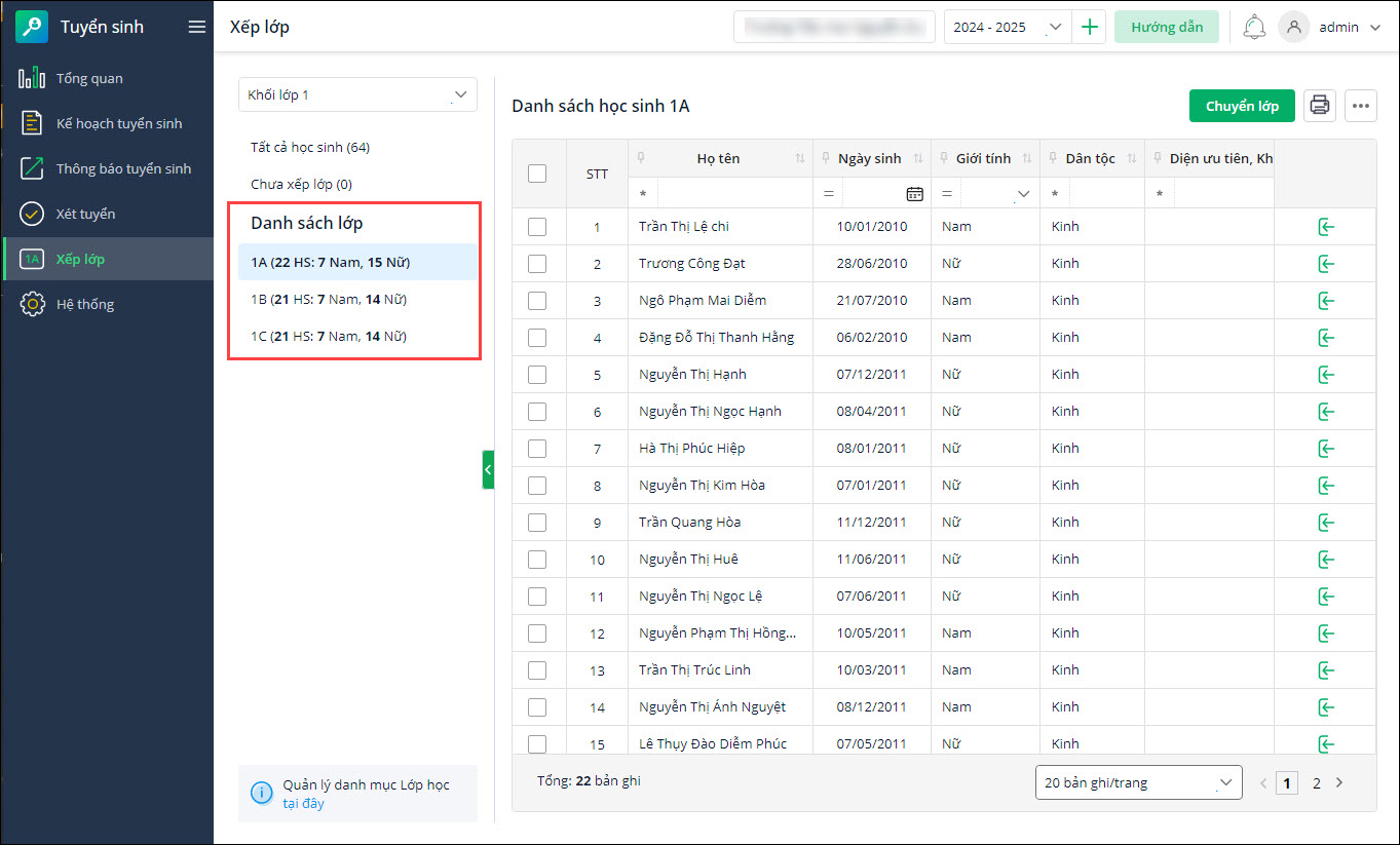 • Sau khi xếp lớp thành công, học sinh được xếp đều về các lớp như tiêu chí đã thiết lập.