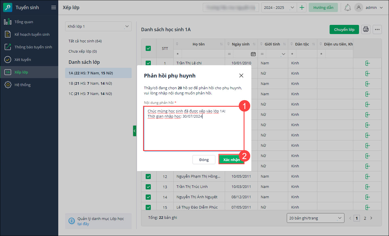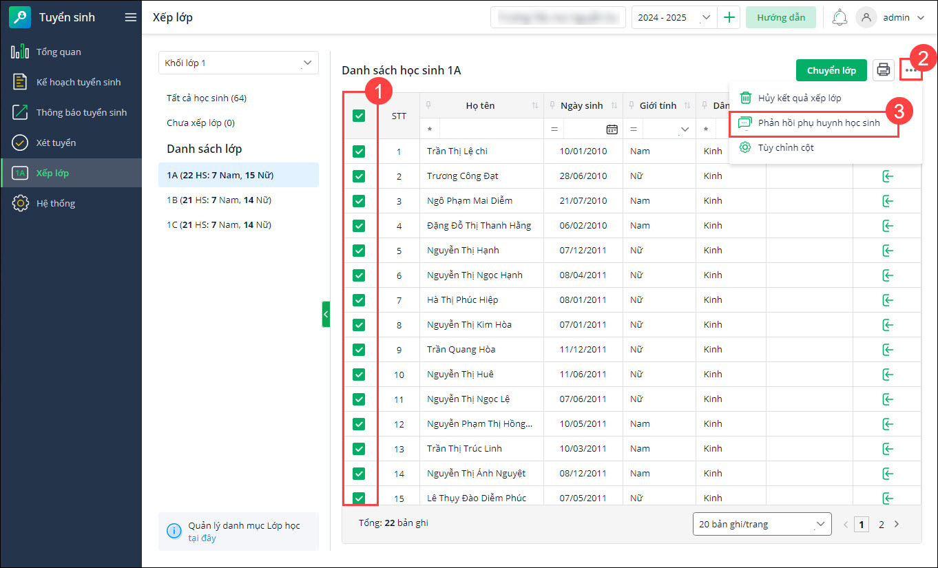 1. Sau khi hoàn tất xếp lớp, cán bộ tuyển sinh thông báo kết quả đến phụ huynh bằng cách tích chọn học sinh, nhấn vào dấu ba chấm, chọn Phản hồi phụ huynh học sinh.