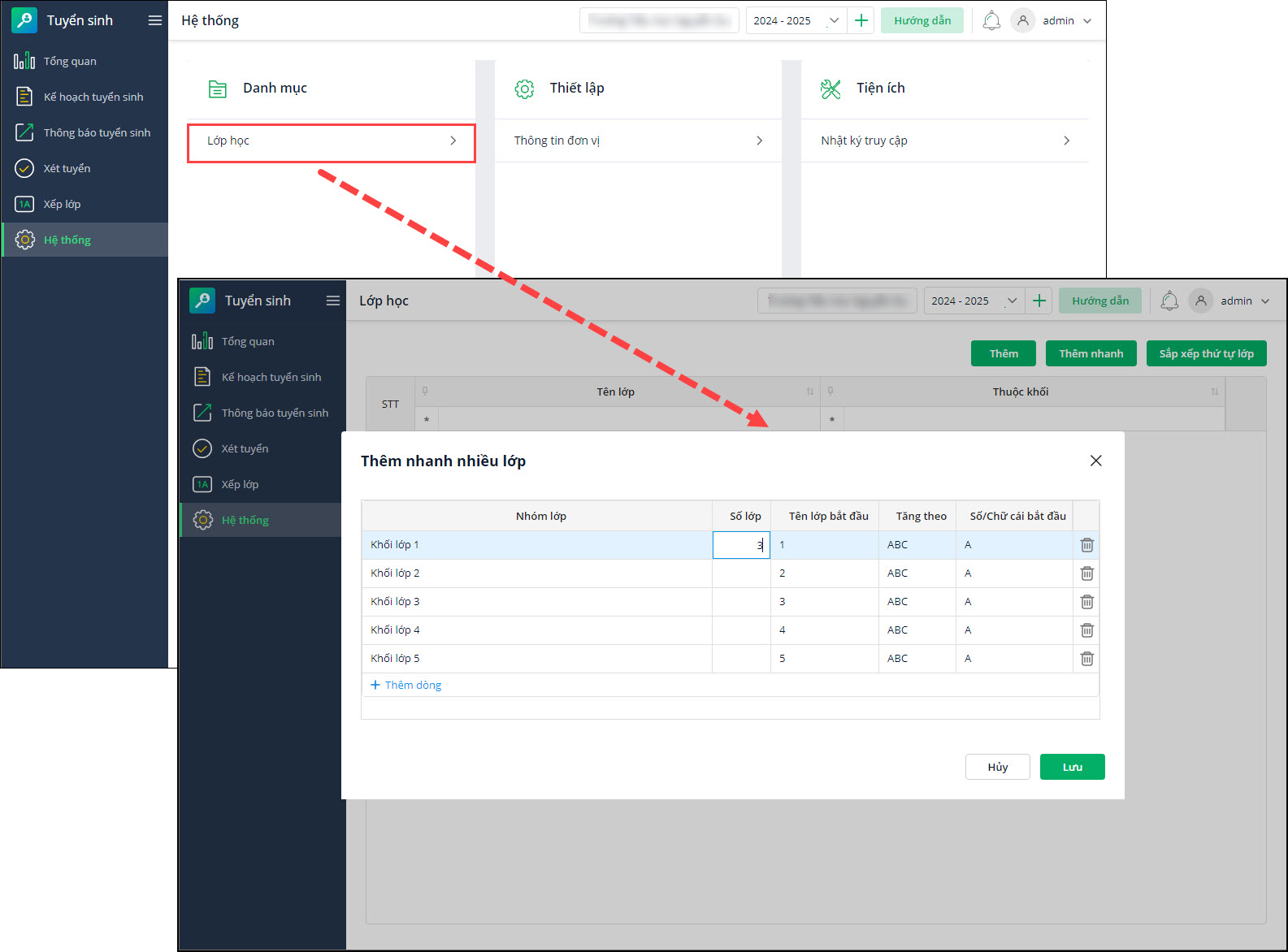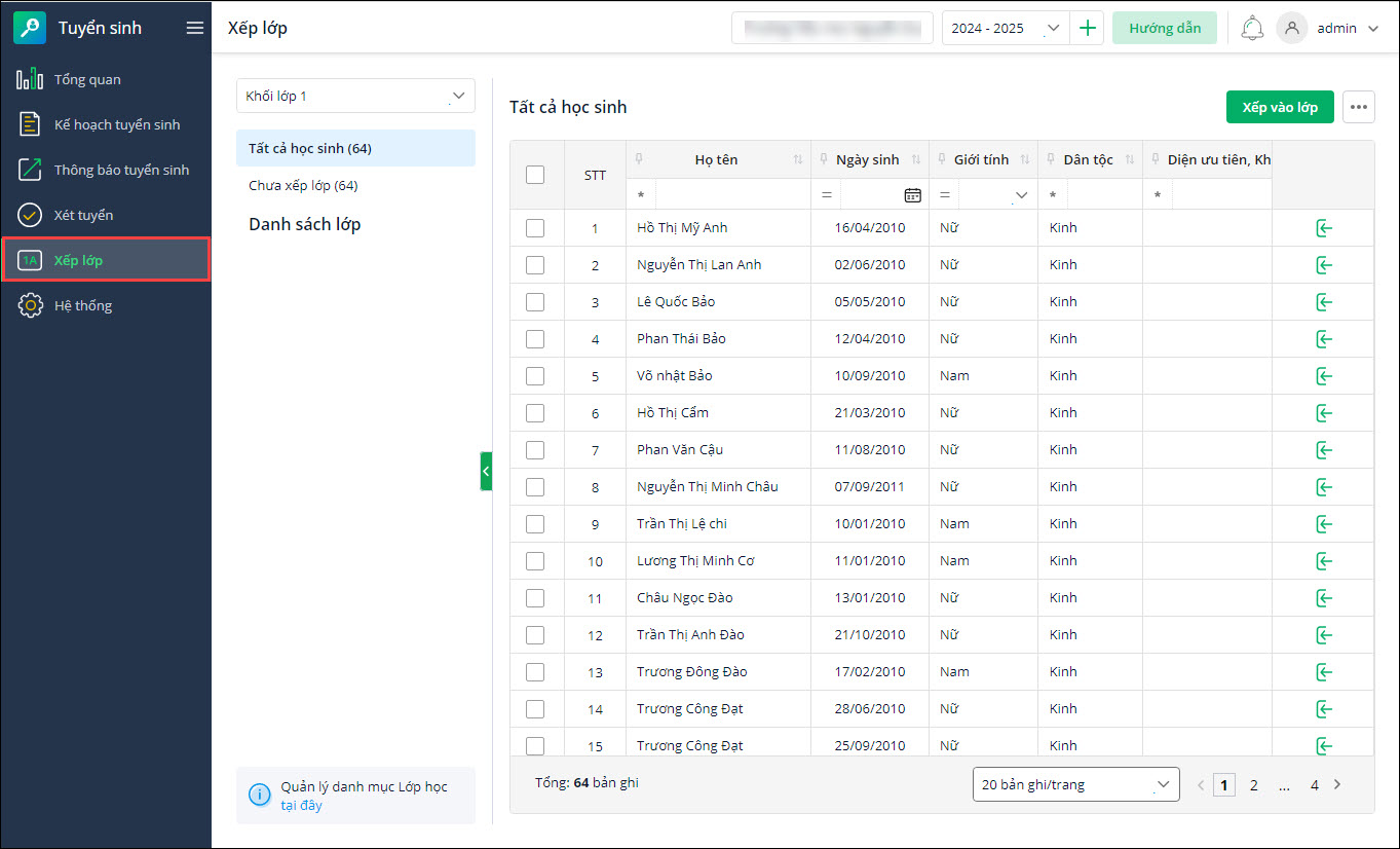 • Trường hợp chưa có danh sách lớp, anh/chị khai báo danh sách lớp theo hướng dẫn chi tiết tại đây trước khi tiến hành xếp lớp cho học sinh.