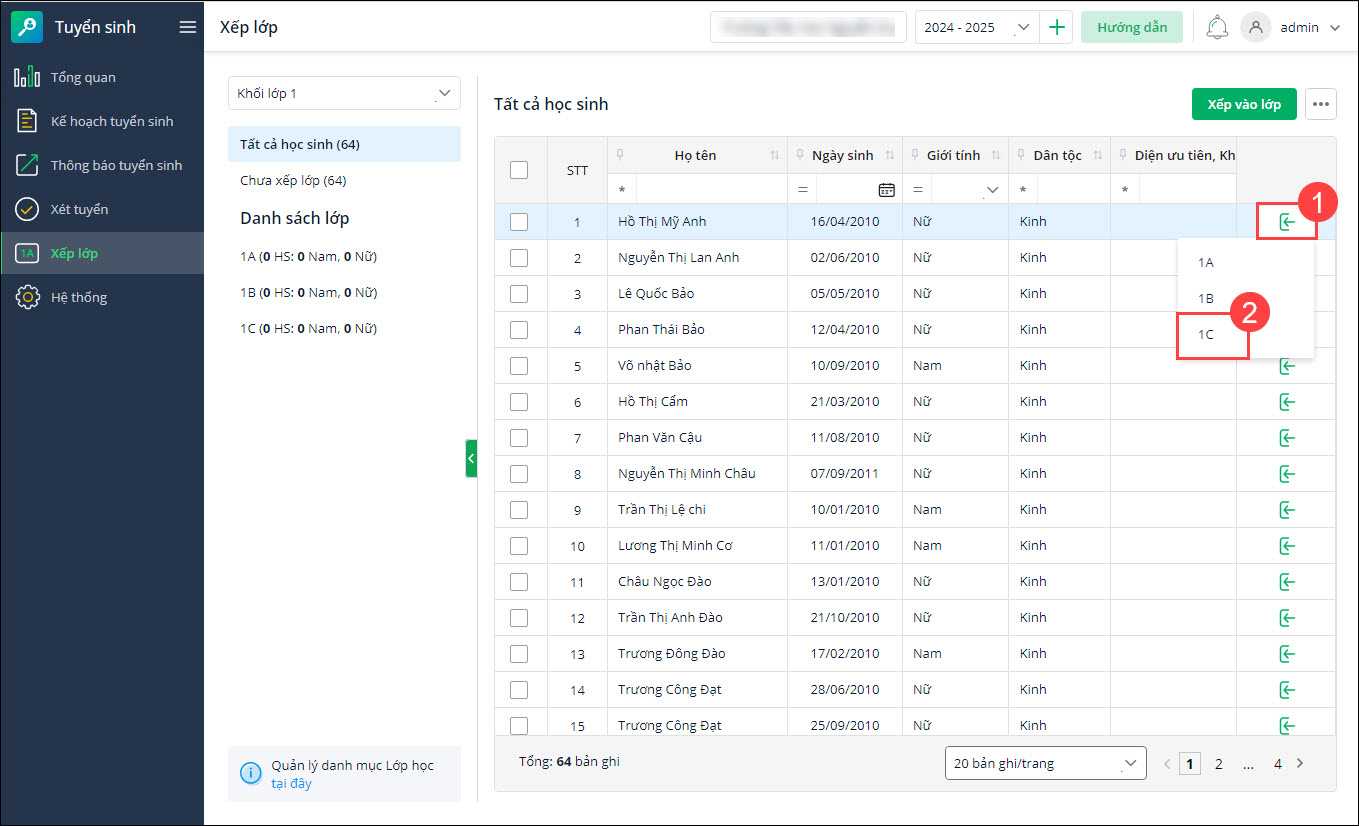 • Để xếp lớp cho từng học sinh, nhấn vào biểu tượng xếp cuối dòng thông tin học sinh tương ứng, chọn lớp muốn xếp học sinh vào.