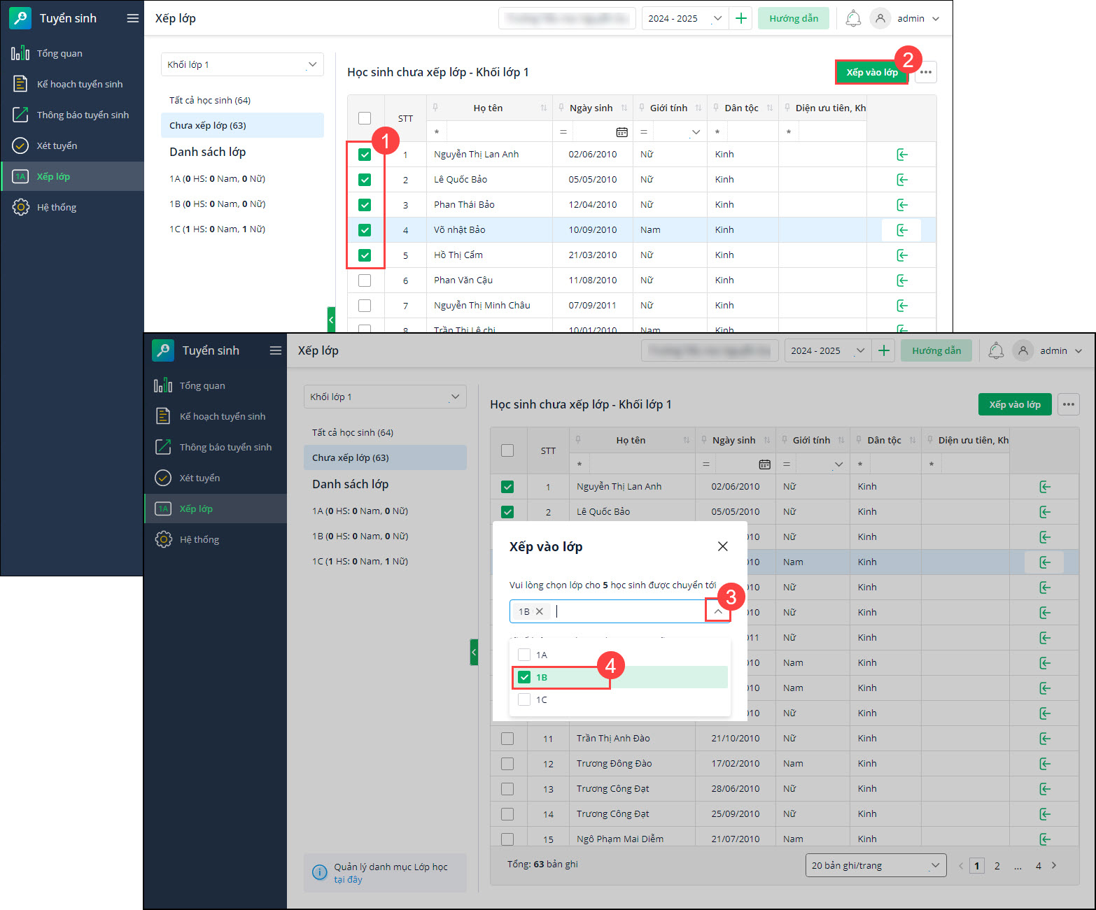 • Để xếp lớp cho nhiều học sinh cùng lớp, tích chọn các học sinh, chọn Xếp vào lớp và chọn lớp tương ứng trong danh sách. Nhấn Xác nhận.