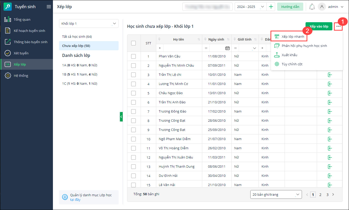 • Anh/chị có thể xếp lớp nhanh theo một vài tiêu chí bằng cách chọn dấu ba chấm, chọn Xếp lớp nhanh.