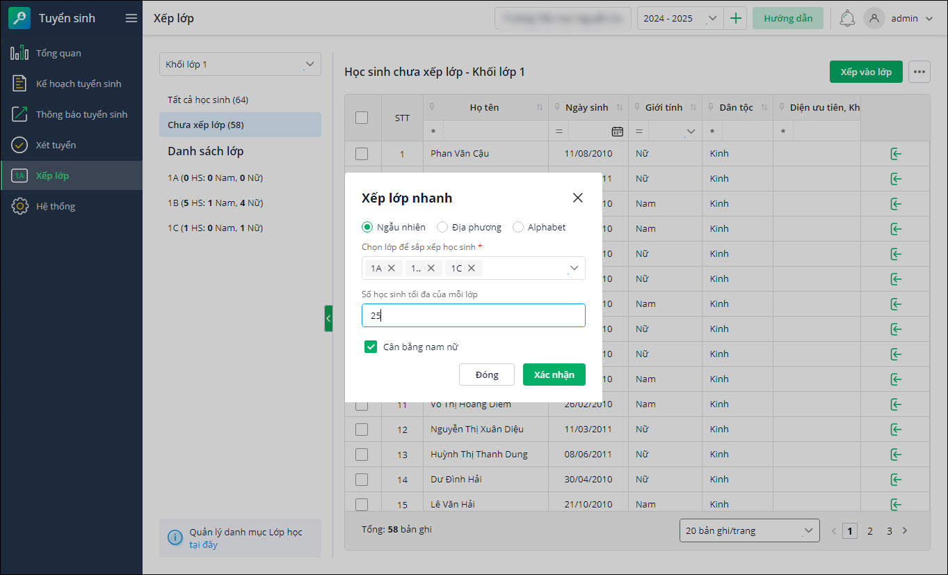 • Nhập số lượng học sinh tối đa mỗi lớp và tích chọn nếu cần cân bằng số lượng nam nữ trong từng lớp. Nhấn Xác nhận để xếp lớp cho học sinh.