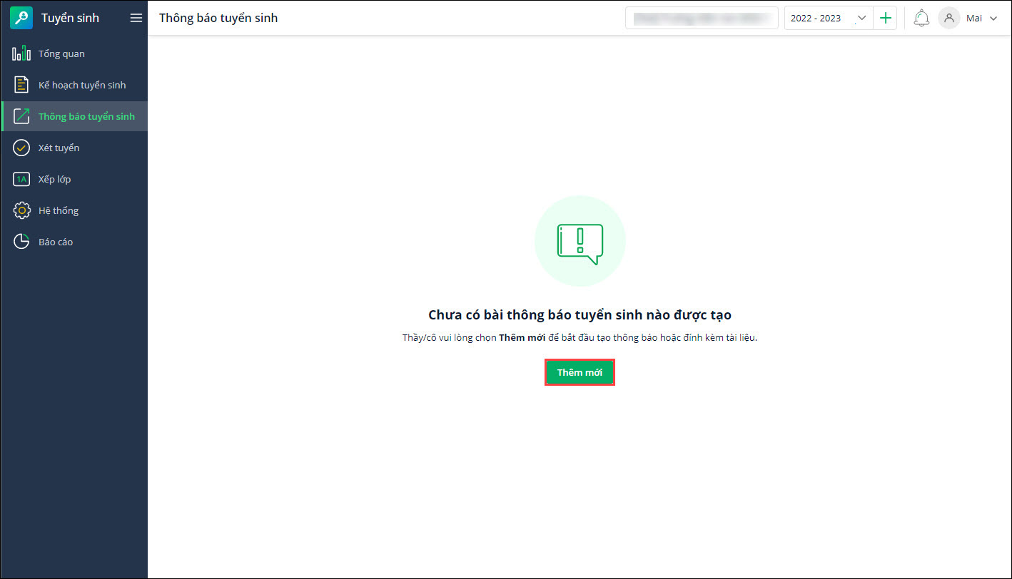 - Vào Thông báo tuyển sinh, chọn Thêm mới để gửi thông báo tuyển sinh.