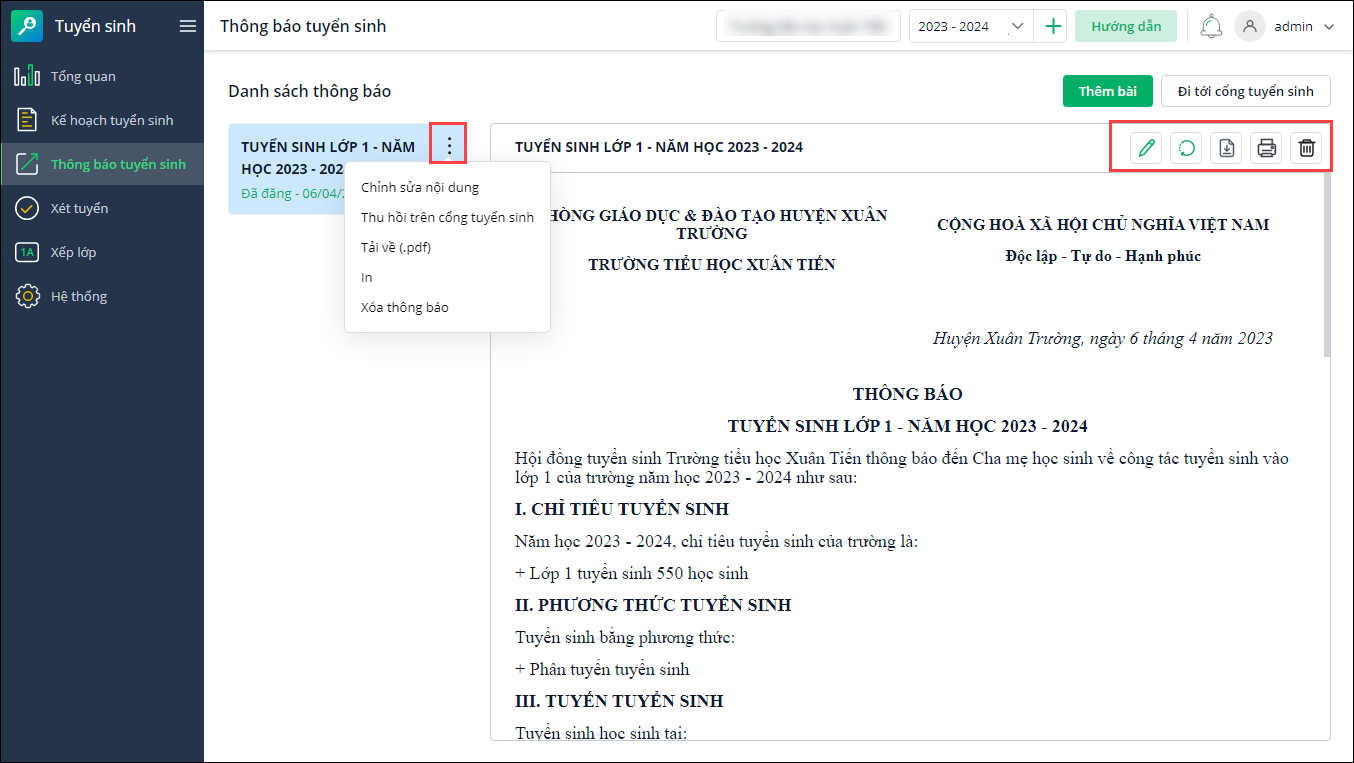 - Anh/chị có thể chỉnh sửa nội dung; thu hồi (đối với thông báo đã đăng trên Cổng tuyển sinh); tải về; in hoặc xóa thông báo bằng cách nhấn chọn vào nút tương ứng hoặc nhấn vào dấu ba chấm bên bên cạnh thông báo.