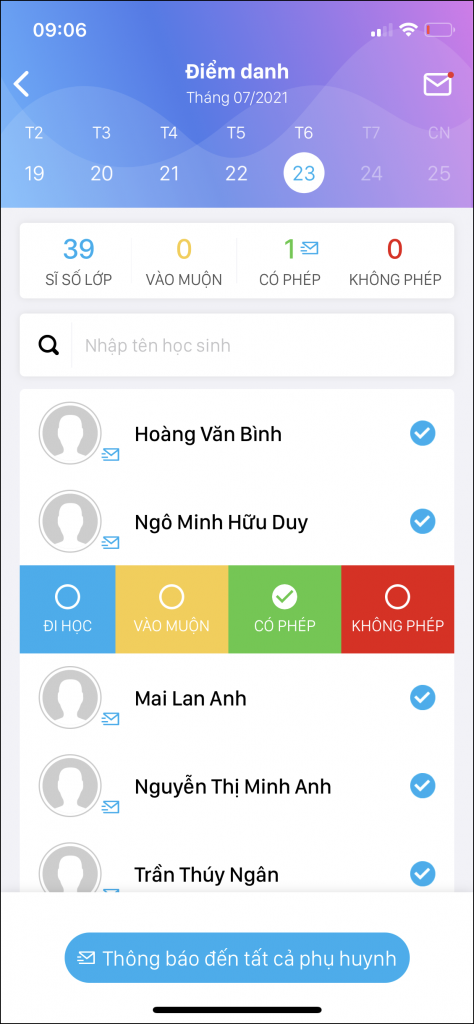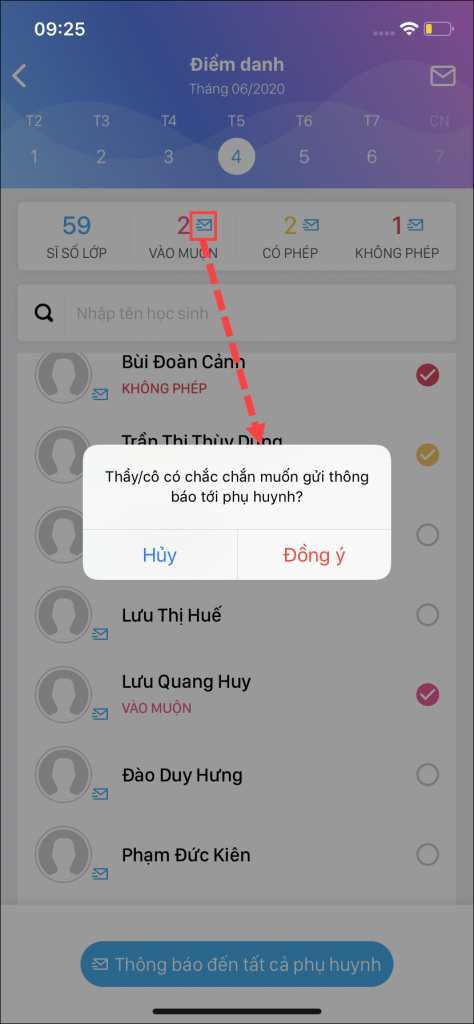 - Sau khi thực hiện điểm danh, anh/chị có thể gửi thông báo cho phụ huynh