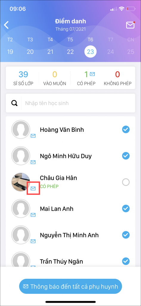 - Gửi từng cho học sinh: nhấn vào biểu tượng “lá thư” phía dưới tên học sinh để gửi thông báo cho phụ huynh tương ứng.