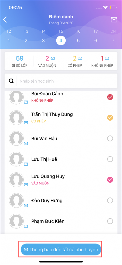 - Sau khi thực hiện điểm danh, anh/chị có thể gửi thông báo cho phụ huynh