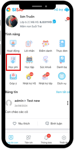 - Trên ứng dụng SISAP Phụ huynh, anh/chị có thể nộp nhanh các khoản thu của con: