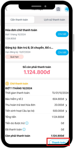 - Chọn Thanh toán để nộp từng khoản thu còn thiếu hoặc chạm vào Thanh toán tất cả để nộp tất cả các khoản thu.