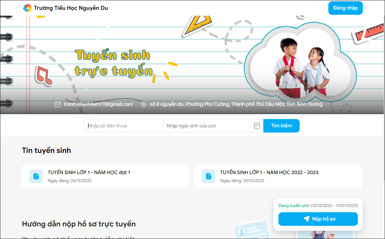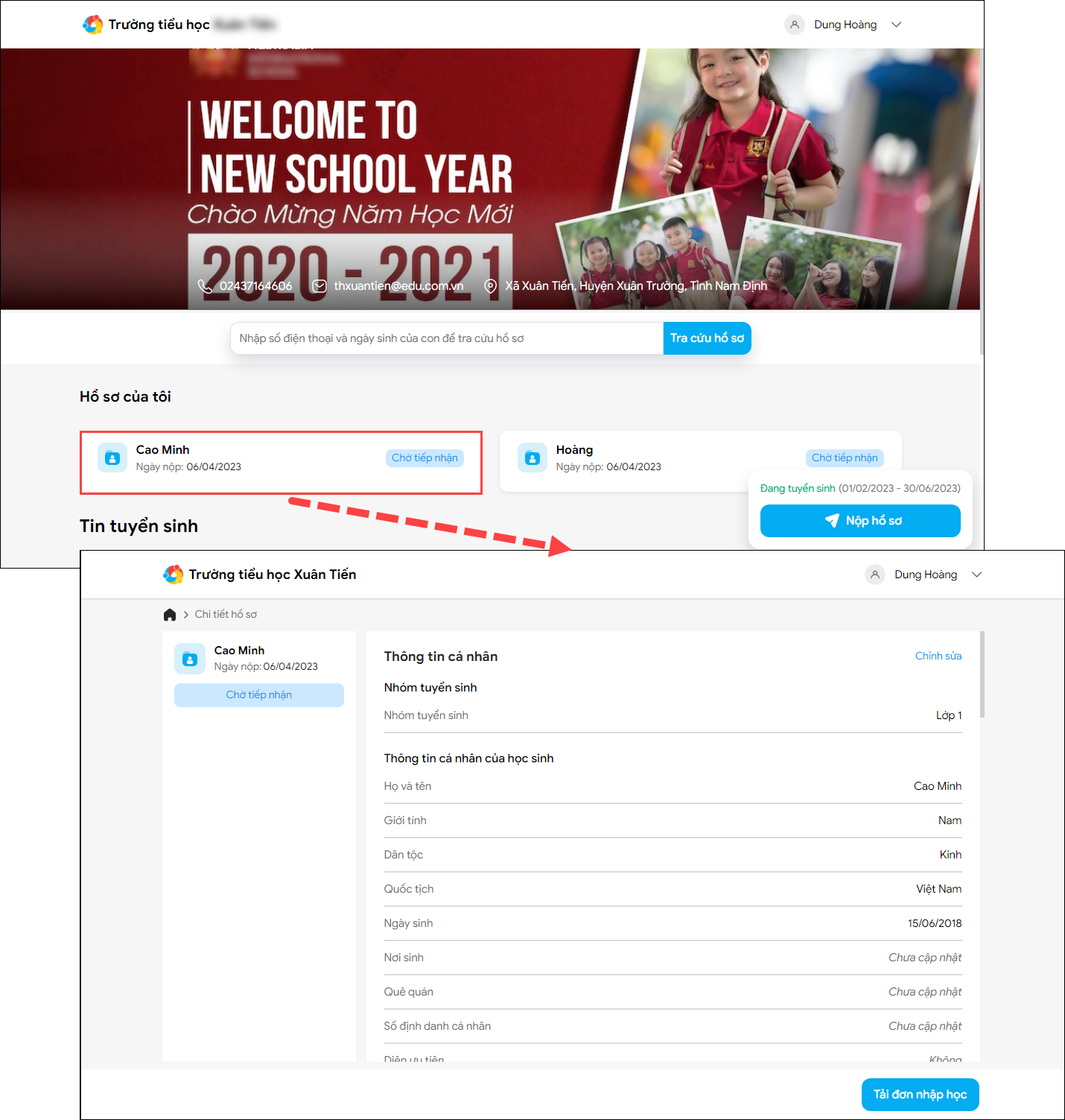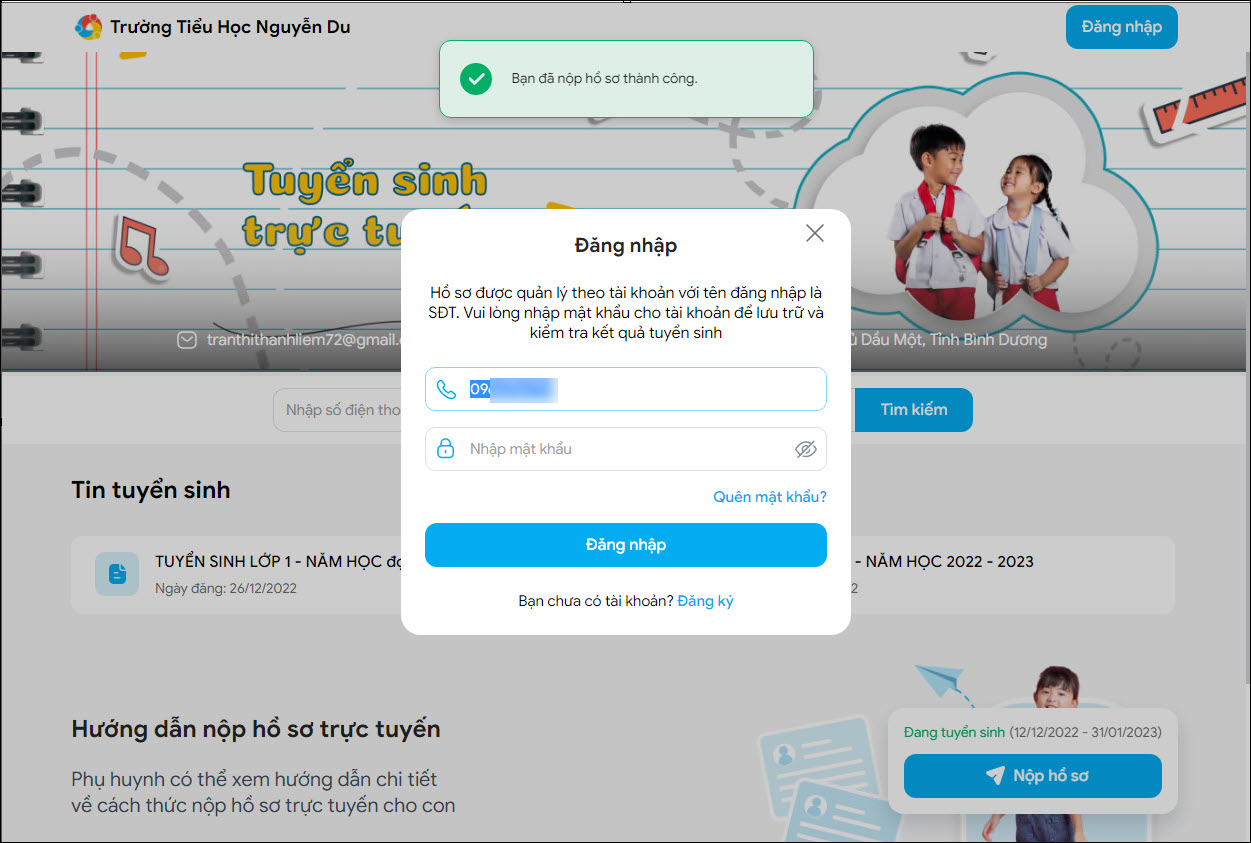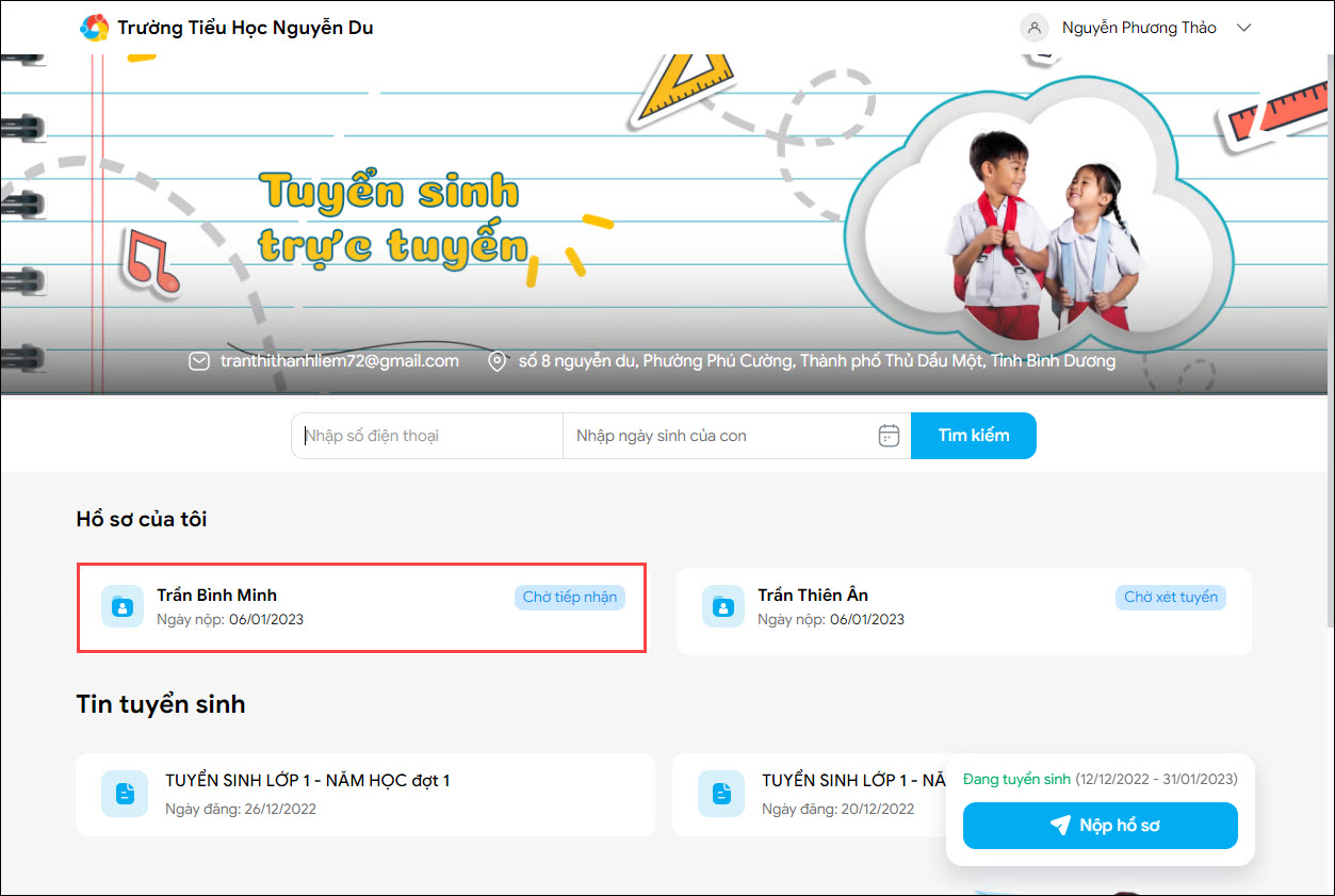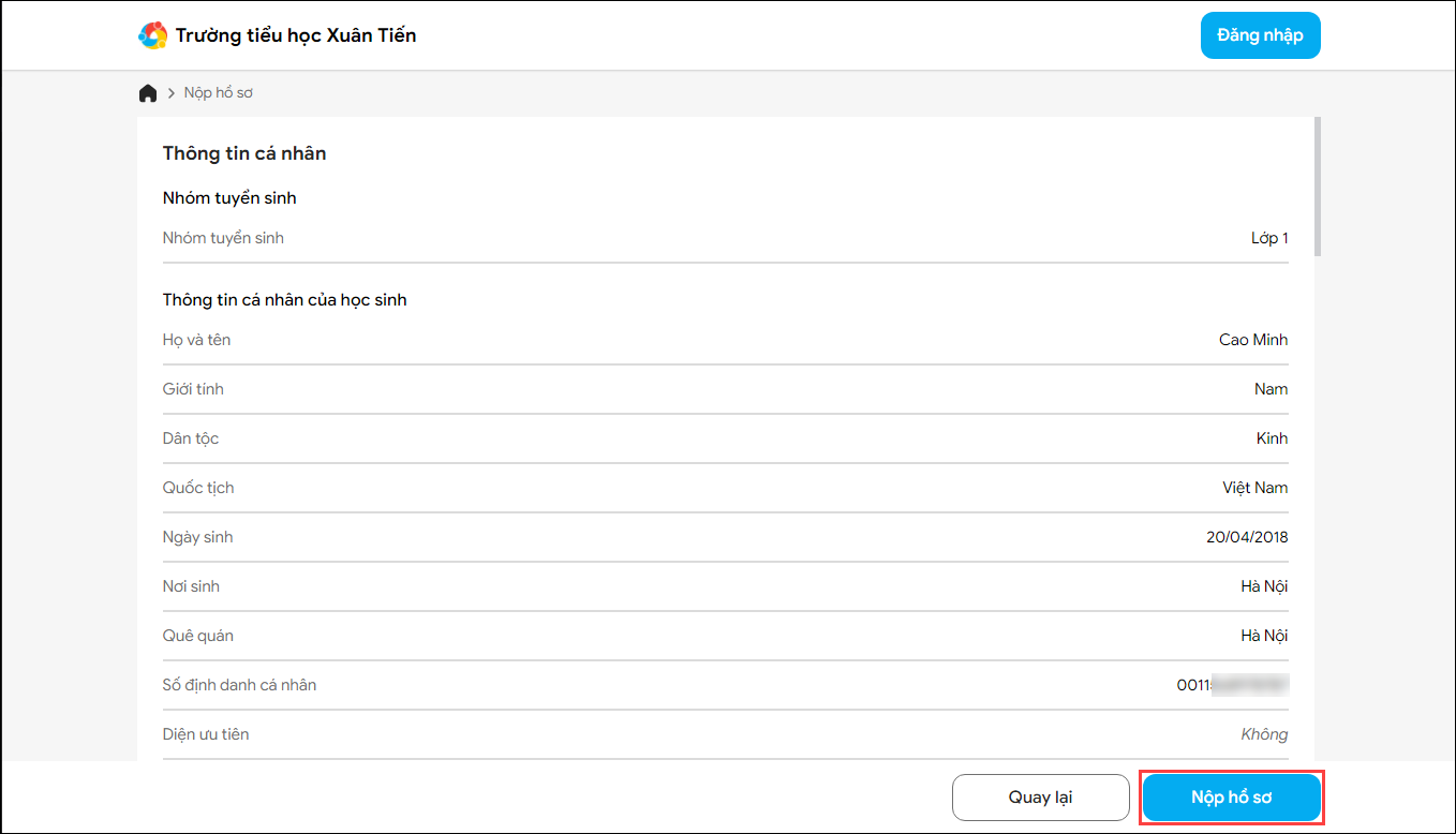 - Sau khi nộp hồ sơ thành công, phụ huynh có thể đăng nhập để xem lại chi tiết hồ sơ mình đã nộp.