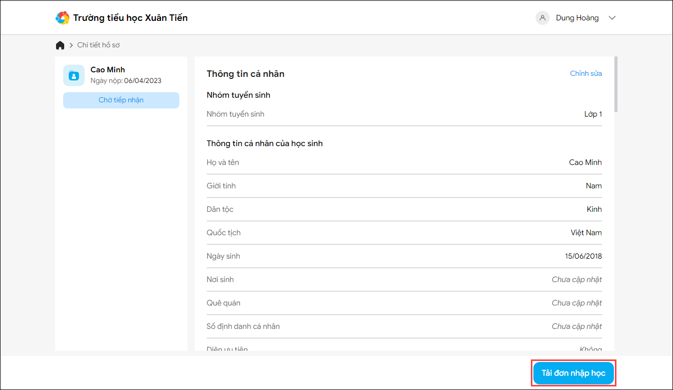 - Phụ huynh có thể tận dụng thông tin đã khai báo trên hồ sơ để Tải đơn nhập học mà không cần khai báo lại và nộp cho nhà trường để hoàn thiện hồ sơ.